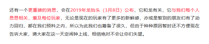 大家好,这里是叶子猪逗你玩栏目,我是逗大帅。 说起国内知名的回合制游戏,网易就占了俩。除了《梦幻西游》另外一款就是《大话西游》。《大话西游》从2002年运营至今已有17年,就连同名手游也已经运营3年了。 一款游戏坚持这么久,自然不是靠着单纯“换汤不换药”的运营活动来支撑,更新是让玩家一直保持新鲜感的唯一路径。 在今年3月8日,《大话西游》手游上线了一个新的神秘站以及放出了一个新的宣传片。在神秘站中醒目的标示了“2019新的大话故事即将开始”,所以小编猜测此次《大话西游》手游的这些动作,必将是有大更新。虽然暂时不知道是否会颠覆传统玩法,但肯定会影响后续内容。 值得一提的是3月8日不止是妇女节,在中国传统农历中还是2019年的“龙抬头”。纵观此次《大话西游》手游中放出的神秘站以及宣传片,都有“龙”的影子。 能为一次更新放出宣传片以及搭建神秘站,可以肯定必须是大事!小编凭借着多年饱玩各类游戏的经验来看,新版本也无非以下这几种可能: 新BOSS、新召唤兽、新坐骑、新武器、新种族、新地图。 距离《大话西游》上一次推出新种族是鬼族,在2008年,至今已经十多年了,所以,小编毫无疑问甩“实锤”,这次大话手游就是要出新种族了! 当然,绝对不是空穴来风,近期大话手游除了神秘站、概念片中“龙”的爆料,官方在今年的种种操作中已经几乎将新种族完全透露了。 事件一:今年年初大话西游开发组的开年信 这里重点原文已标红,我们可以关注到“与我们每个人息息相关,惠及每位玩家”,如果是新装备、召唤兽的话肯定不会是每人都有,假设真的人人一手新装备和召唤兽,烂大街的东西也并没多“重磅”,玩家也不会买账,这里退一步考量,从这里可以看出,大概率是新种族。 事件二:静海潜流秘器初现宣传海报 东海渔村作为游戏的玩家出生地,近日发布的海报当中的配文也提及,到时玩家的全新故事在这里出发,“起点”、“东海”…… 我们再来看看这海报,焦点无疑是里面的“秘器”——弓和锤,什么东西可以使用武器?新种族呀! 事件三:除了概念站上线,当日的官方资讯也大有玄机 最最最让小编石锤的一个点其实是龙抬头当天的一篇通稿资讯,这当中定义了什么样的事件才算的上是官方认为的“大”与“重磅” 新资料片带着“鬼族”上线算一个;(新内容) 免费版上线算一个;(新产品) 手游版上线算一个;(新产品) 那如今,手游版作为一个产品当中要发生大事件的话...还不是新资料片带着新种族? 事件四:混沌入侵系列活动接踵而至 官方为了新种族构建了新的世界观,且提前了操作了很多预热活动在围绕龙和海,也可谓是对新种族非常上心。 事件五:端游开发组论坛大爆料 如果觉得这些“实锤”还不够,那么下面这件儿就可以说是让新种族更加族铁板钉钉的了。二月份,大话端游的正牌开发组忽然出现,告诉玩家开发组设计了一个新角色,并且新角色有着非常大的来历…… 假如真能更新新资料片和种族,相信也是老玩家回归、新玩家入坑的最佳时机,这样开年信感夸下海口让流失玩家回归的举措就说得通了。 当然,瞎哔哔了这么多,也是小编自己YY,官方透露《大话西游》手游将在4月更新,如今4月已过半,到底会有哪些重磅事件?马上就会揭晓!我赌半根辣条,肯定有新种族! |