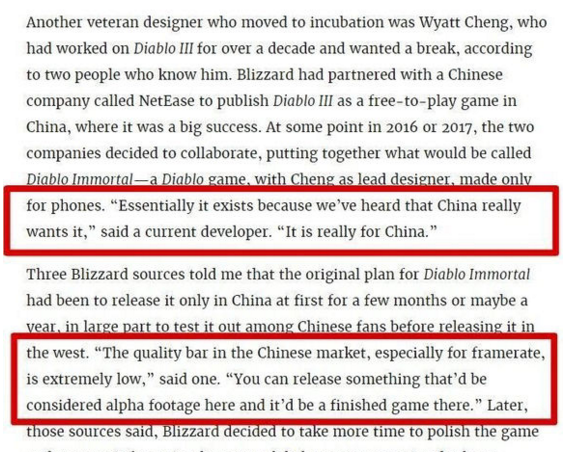 在2018暴雪嘉年华上,最让粉丝们觉得遗憾的就是没有等到《暗黑破坏神4》的到来。因为暴雪曾在之前就暗示要公布暗黑破坏神系列的新作,这让无数暗黑粉丝都以为暗黑4终于要来啦!结果暴雪所说的新作并不知PC端上的作品,而是移动端上的《暗黑破坏神:不朽》,这让很多暴雪玩家都觉得疑惑,暴雪不是一向都做主攻PC端的吗,怎么突然去开发移动端的市场? 因此暴雪作出了解释,之所以研发移动端的作品,是因为暴雪打算把自家所有的PC端游戏都研发相对应的移动端版本,更有传言《魔兽争霸》的手游版正在开发中,就像《暗黑破坏神3》到《暗黑破坏神:不朽》一样,也许《守望先锋:不朽》、《风暴英雄:不朽》和《星际争霸:不朽》都在计划内! 近日,在外媒kotaku对暴雪展开的匿名采访中,被采访的设计师就透露了暴雪对手游的一些真实看法。该设计师表示,之所以推出手游,其中有很大一部分原因在于中国市场,他们觉得中国玩家更喜欢玩手游。甚至可以说,《暗黑破坏神:不朽》能够出现,就是因为他们听说中国玩家非常喜欢,这是一款主攻中国市场的手游。 而暴雪认为中国玩家对手游的质量标准标准非常低,尤其是帧数,发布被欧美视作“测试版”的作品会被中国玩家认为是完整的。游戏帧数一直以来都是是影响游戏体验的一项重要的要素,60帧和30帧之间的体验相差很大,国外很多游戏之所以差评大部分都是因为帧数优化不好,影响了体验。 也许暴雪觉得中国玩家对帧数的要求并不严格,因此他们可以减少优化方面的工作,把重心放在更核心的地方。 |