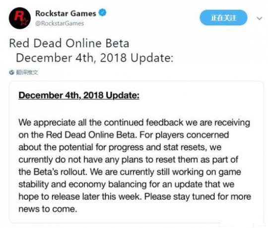 在《荒野大镖客:救赎2》在线模式Beta测试上线之初,R星曾在公告中表示:“我们希望可以长期保存玩家在早期测试版中的游戏进度,但正如很多类似这样的大规模在线测试,总有可能出现问题,致使我们必须重置等级或其他数值。”这也让不少玩家担心自己积累的资源和等级在重置后付诸东流。 R星官推今天首先向玩家们不断发回反馈表达了谢意,随后他们也对担心进度、数据重置的玩家们表示,目前官方没有在测试完成时重置数据进度的计划;目前官方仍在针对游戏稳定性和经济平衡进行改进,他们希望在本周晚些时候推出更新。