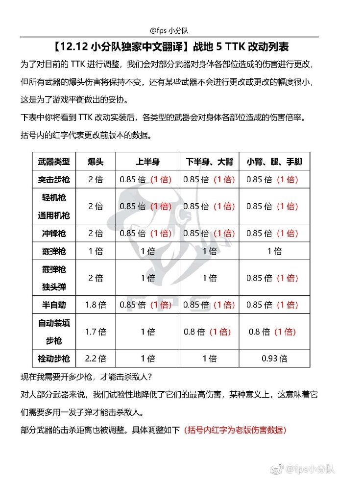 最近DICE修改了《战地5》大部分武器的伤害,让玩家不再那么快就被打死,同时这也意味着玩家杀人也比之前难一些。 如上图,这是各类武器对人体各个部位的伤害倍率,括号中的红字是修改前的倍数。 可以看到除了爆头之外,打中玩家身体的其他部位所造成伤害都有了下调。值得一提的是,霰弹枪和螺栓式步枪,这两种枪的伤害并没有得到削弱,没有被改动。 DICE解释说,大部分武器的最大伤害现在被下调,这意味着使用受影响的武器击杀敌人平均要比之前多用一颗子弹。 此外,部分武器的击杀距离也被调整,具体请看下图中的说明。 如果你无法适应这次的改动,你可以在匹配界面选择“硬核征服”服务器列表游玩。 图片来自微博博主@fps小分队: |