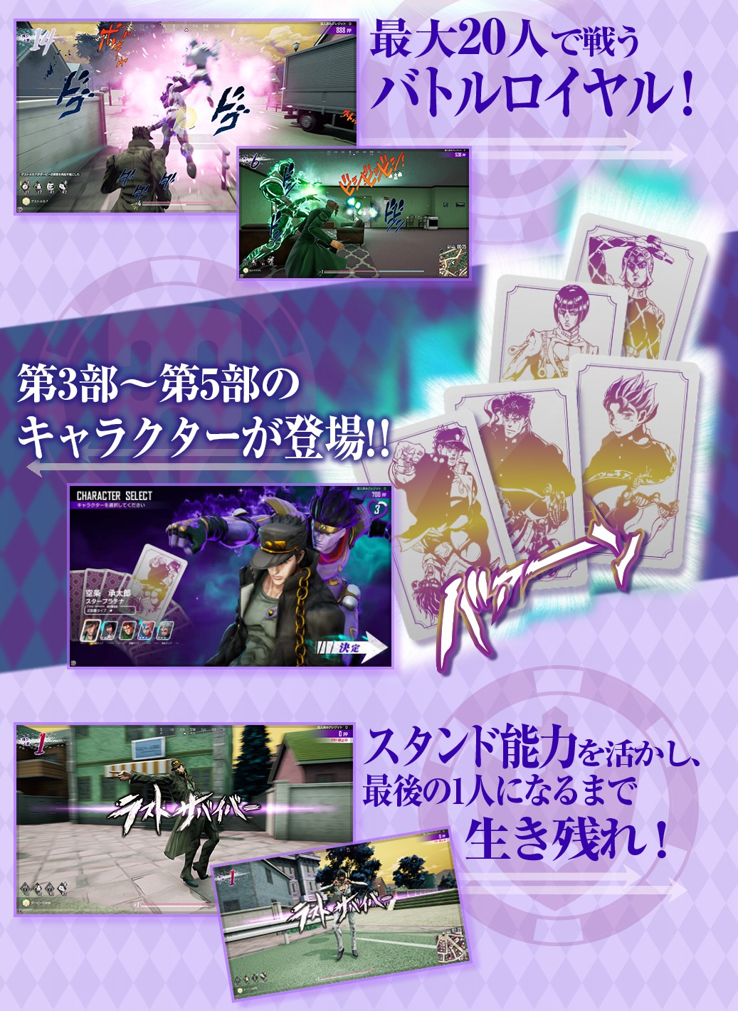 万代南梦宫今天公布了街机游戏新作《JOJO的奇妙冒险:最后的幸存者》,根据介绍,本作的玩法类似于“大逃杀”,支持最多20位玩家同场竞技,最后存活的玩家才能获得胜利。官方同时公开一支预告片,其中展示了部分游戏画面。 《JOJO的奇妙冒险:最后的幸存者》使用虚幻引擎开发,将收录《星尘斗士》《不灭钻石》《黄金之风》这三部作品中的角色,从官网公布的游戏画面来看,玩家可以操纵角色和他们的替身,在杜王町展开一场大混战。本作预计将于2019年夏季正式上线。 视频画面:
