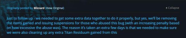 《魔兽世界》8.1版“复仇之潮”上线后,有玩家发现Bug,可以反复击杀新战争前线的世界Boss森林之王伊弗斯,获取装备。于是不少玩家纷纷去击杀Boss,来获取自己想要的奖励。今日《魔兽世界》官方发布蓝贴,宣布将对滥用这个Bug来获利的玩家进行处理。 从蓝贴中可以看出,此次暴雪对滥用Bug玩家的处置方式是封号+清除所获奖励,具体的封号时长将根据玩家滥用Bug的程度来决定。而玩家通过Bug获得的装备,以及通过分解这些装备得到的泰坦残血精华都会被收回。 暴雪将用几天时间把相关数据整理出来,并作出合理的惩罚措施。具体处罚力度和处罚名单,玩家可以关注官方的通告。 |
