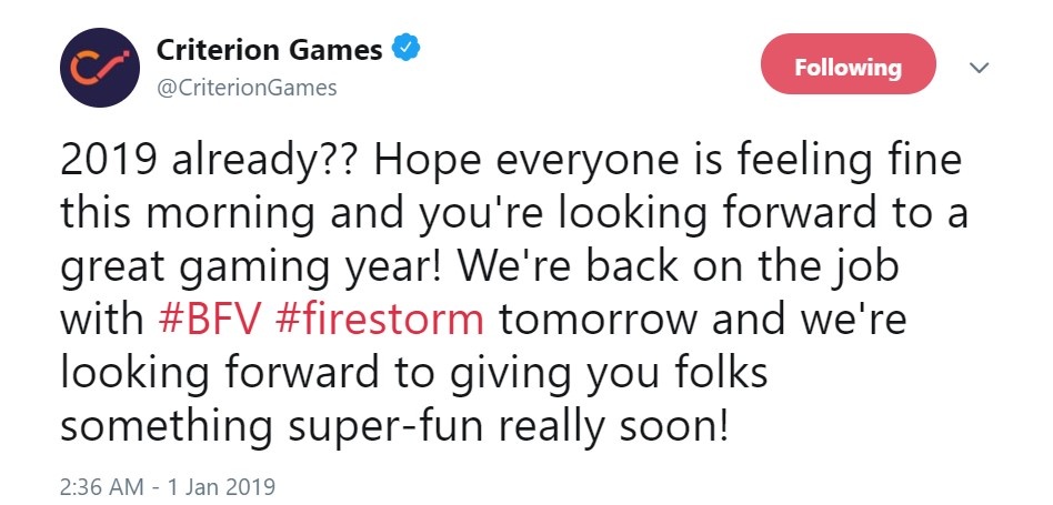 《战地5》大逃杀模式“烈焰风暴”由《火爆狂飙》、《极品飞车》开发商Criterion Games和DICE共同开发,近日Criterion Games官方Twitter发布消息,确认《战地5》大逃杀模式很快将有新的消息公布。“我们明天将开班回归到《战地5》烈焰风暴的开发中,我们将很快给大家带来超级兴奋的消息,敬请期待。” 《战地5》官网之前发布的“烈焰风暴”首批细节: 在火环之中发动战争,火环会让战场慢慢缩小,玩家请不要被困住了 战斗是由64名玩家,以16支步兵小队组合而成,最后一支存活下来的步兵小队获胜 加入了《战地》载具,改变了整个游戏,让玩家可以歼灭毫无戒备的小队,或驾驶运输载具保持一线生机 小队要团结一致,共同朝目标努力,获取更精良和稀有的装备 在有史以来最大的《战地》地图上作战 通过场景破坏来改变地图 体验《战地》惊人的影像和音效效果,让大逃杀身临其境 比赛是和玩家的连队和《战地5》进度挂钩 《战地5》大逃杀模式将于今年3月正式上线 |