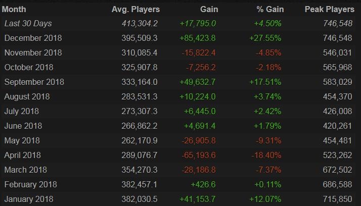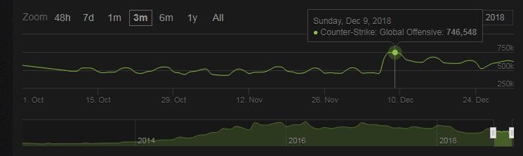 《CS:GO》在去年12月凭借着一波免费和引入大逃杀模式的惊人操作打开了大闸,和突然激增的大量差评相伴的,也是玩家数量的显著增加。 根据数据统计,有20535709位不同的用户在12月享受了biubiubiu的快感,这是11月份玩家人数的两倍。翻阅SteamCharts和SteamDB的详细数据追踪,我们能够很明显的看出平均玩家以及峰值玩家数目的变化。12月7日,《CS:GO》宣布免费同时开放危险地带模式,导致了两天时间内图标上数据的明显上升,也在9日达到了峰值。 12月,SteamCharts统计的平均玩家数为395509,峰值玩家数为746548。而在11月,这两个数据分别为310085和546031。虽然没有打破85万同时在线玩家的记录,这依旧是近年来最明显的激增趋势之一,要知道在2018年,《CS:GO》的同时在线玩家通常不过30万。 早早拥有《CS:GO》的玩家相当多,而在Valve宣布游戏免费的时候,也着实惹恼了很大一批玩家,第一天就收获了14000+的负面评论。然后在事情过去1个月后,正面的评论已经悄然超过了负面评论在新评论中的占有率。 看来这个Steam常青藤还将继续稳坐玩家数量第一梯队的宝座,下一个熬死的,是谁呢? |