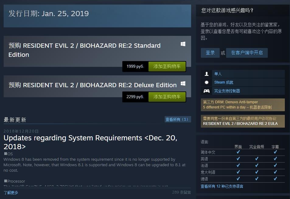 卡普空近年来的游戏均采用Denuvo DRM对PC版本进行保护,而在本月即将发售的最新作品《生化危机2:重制版》中,他们也并不打算有什么例外。从游戏的商店页面中可以看到,本作仍然会采用D加密保护。 《生化危机2:重制版》将于1月25日正式发售,这将会是一款全面重制的作品,而不是像之前一样只升级一下画面。本作从玩法、视效和剧情结构上都有一定的变化,基本上是一款以全新设定讲述同一个故事的游戏作品。 《生化危机2:重制版》的Steam页面近日进行了更新,添加了本作采用Denuvo DRM的警示信息。这其实并不是一个让人意外的消息,最近几年包括《洛克人11》在内的卡普空游戏都采用了D加密,虽然最终都会被破解组织贡献,但在首发阶段多少都会对游戏进行一段时间的保护,对正版游戏的销量也有一定的促进作用。 《生化危机2:重制版》将登陆PC、PS4和Xbox One平台,使用之前开发《生化危机7》时的RE引擎,该引擎也将在3月份发售的《鬼泣5》中得到应用。 |