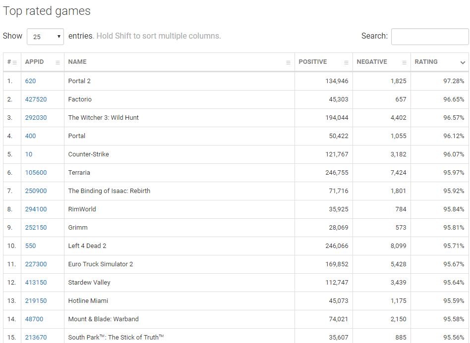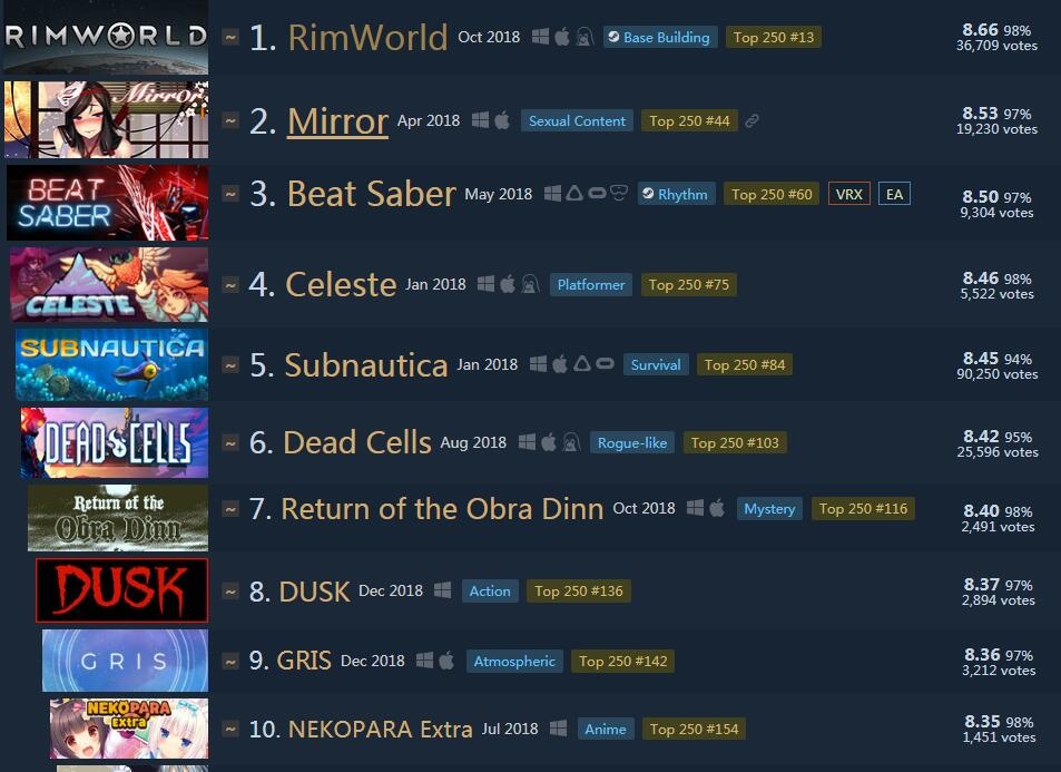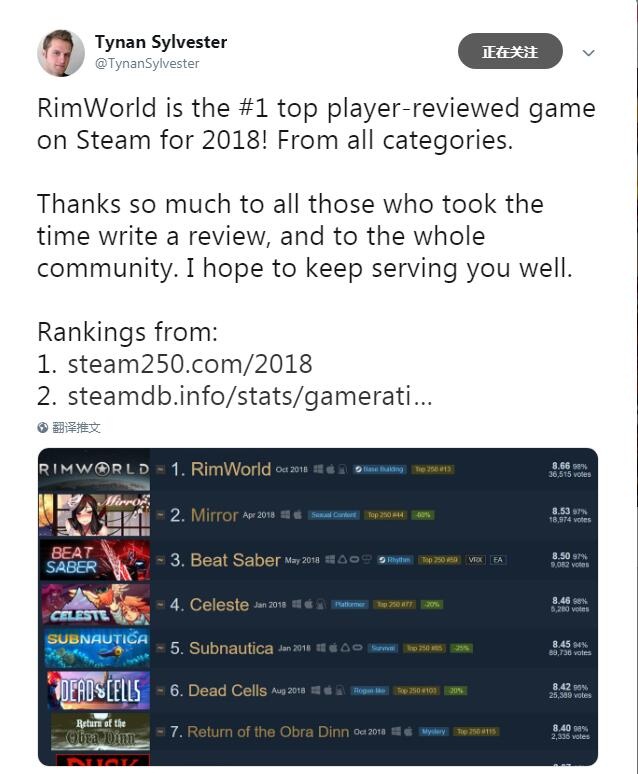 2018年全Steam游戏中“最受玩家欢迎”(有效评价中好评率最高)游戏的榜单已经出炉,在2018年10月正式发售的《环世界》摘得桂冠,而游戏的作者Tynan Sylvester也在第一时间于推特和粉丝们共享了这份喜悦。 “《环世界》当选了2018全年所有分类中最受玩家好评的游戏第一名!感谢那些花了宝贵的时间给我撰写评论的人们,感谢整个玩家社区,我会努力继续让你们感到满意!” 随后Tynan附上了排行的来源,即玩家自发运营的统计网站Steam250以及与Steam有密切合作的SteamDB。Steam250是不满V社算法的游戏社区用户们设计了一个新的推荐和评分机制,追求绝对公平的一个统计网站。在这个机制下,会对每款游戏进行打分,根据分数高低进行排名。每天这个Top250的榜单都会进行更新,每款游戏的排名浮动情况也会体现出来。 而从老牌统计网站SteamDB中可以得知,《环世界》游戏也已经冲上了全Steam历史中玩家好评率最高的游戏榜单前十,排在第八的位置,着实可喜可贺。 虽然现在Steam评论没有任何限制,但这的确从贴近玩家的角度表现了这项游戏的殊荣,也希望Tynan和他的团队能够保持势头,给玩家们带来更棒的体验。 |
