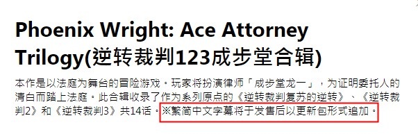 《逆转裁判123:成步堂精选集》现已上架Xbox游戏商城,据Xbox商城页面显示,《逆转裁判123:成步堂精选集》将会用更新的形式追加简繁中文字幕。 《逆转裁判123:成步堂精选集》包括了《逆转裁判:复苏的逆转》(全部14个章节)、《逆转裁判2》和《逆转裁判3》,并对游戏画面进行了高清重制,还重新绘制了角色形象,游戏中的用户界面和选项也经过了重新设计,玩家可以选择音乐和音效的音量,对话窗口的透明度和文本跳过的方式。游戏提供日语和英语两种语言,而每款游戏和每个语种都有多达10个不同的存档位。 《逆转裁判123:成步堂精选集》将于2019年2月21日登陆PS4/Xbox One和Switch平台,还会同步推出实体收藏版和卡普空官方商城限定版,PC平台Steam版预计于2019年春季发售。 |