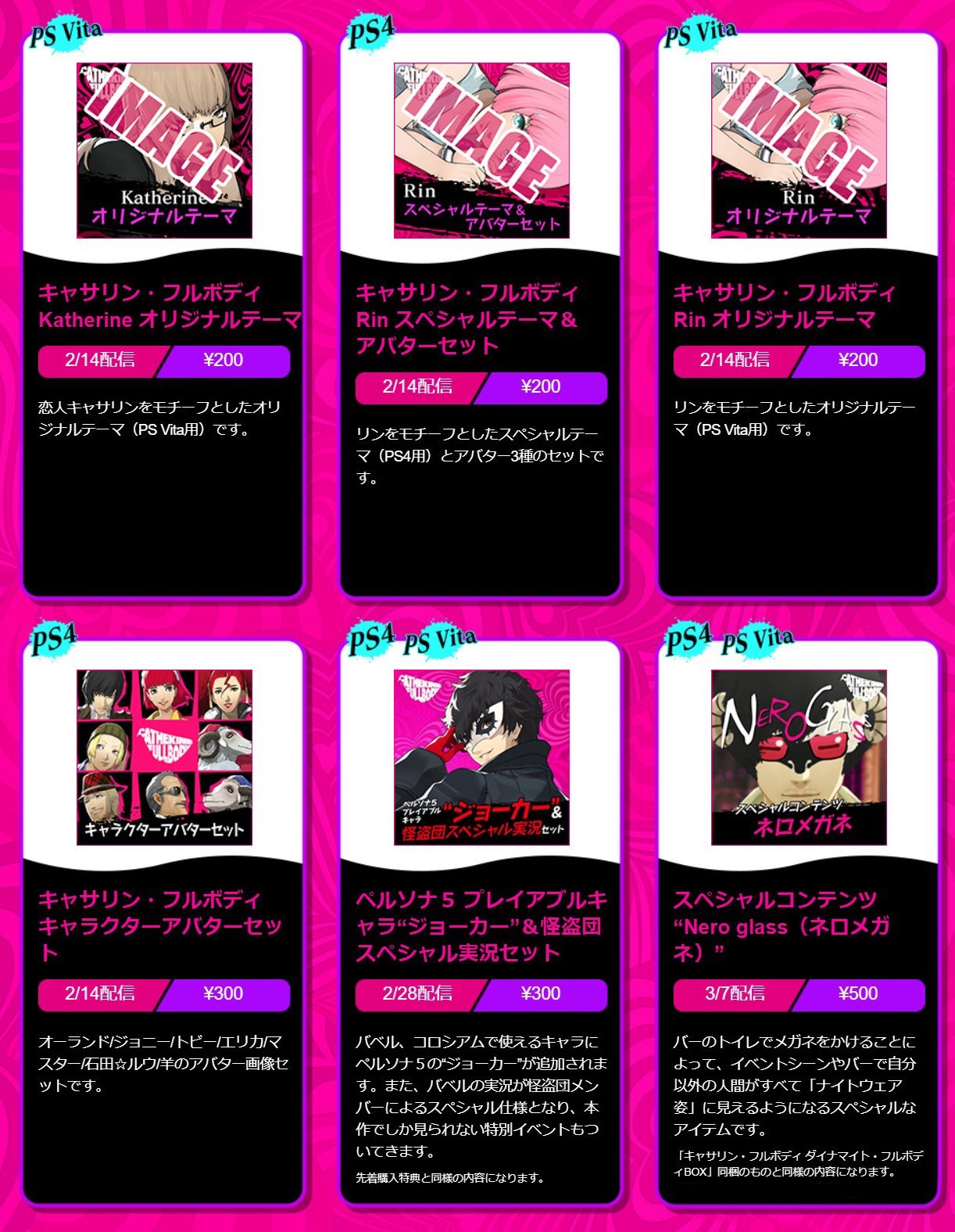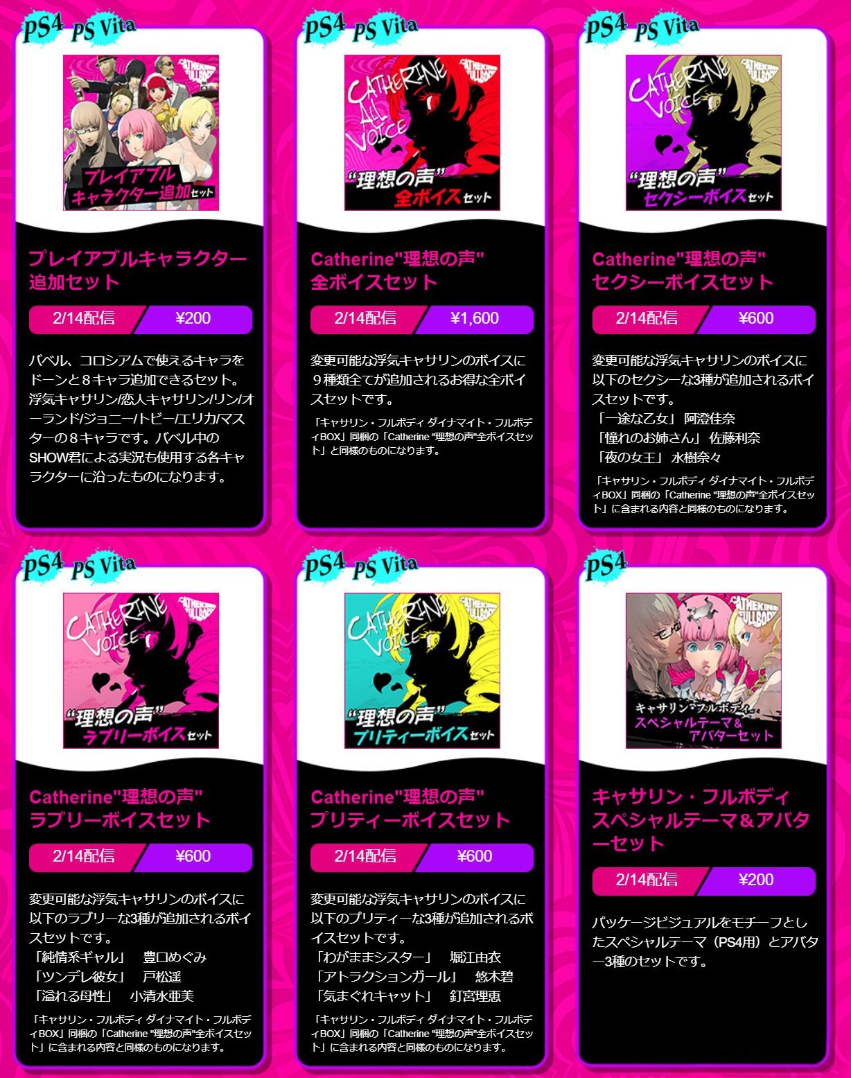 近日Atlus公布了《凯瑟琳:玉体横陈》各种DLC的相关情报,除了追加可操控角色(8人200日元)外,首发特典以及限定版的各种DLC都会单独出售。 其中C凯瑟琳全9种理想之声打包1600日元,3个1组单买各600日元,《女神异闻录5》联动Joker 300日元,透视眼镜500日元,此外还有各种主题头像等内容。 《凯瑟琳:玉体横陈》将于2月14日发售,登陆PS4和PSV平台。 |