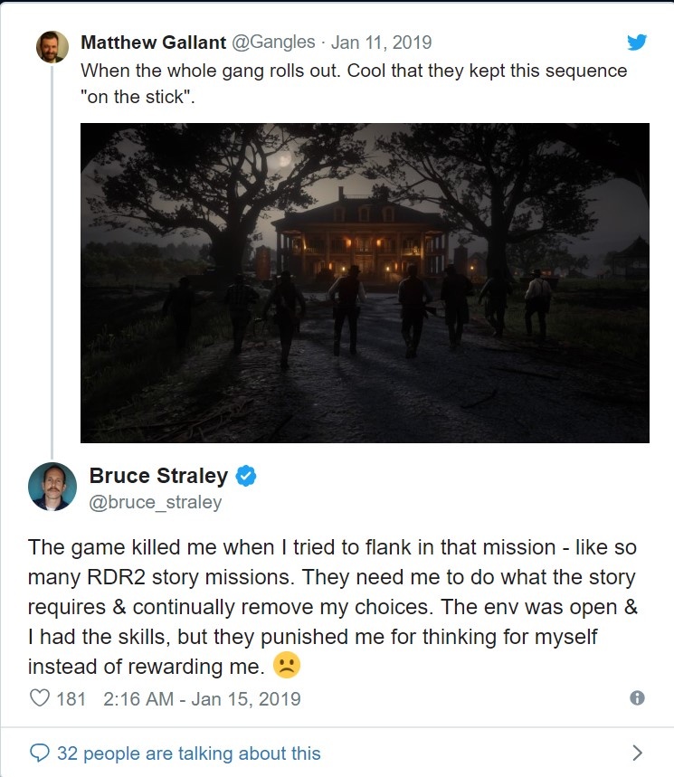 《荒野大镖客2》去年赢了很多奖,包括TGA的最佳音效设计、最佳剧情等奖项。此外它还是Metacritic上2018年发售游戏中评分最高的游戏,同时也是有史以来首周最赚钱的娱乐作品。尽管如此,但还是有媒体和一些有影响力的人物发现了本作的一些问题,证明没有一个游戏是完美无缺的。 最近《美国末日》和《神秘海域4》的游戏总监Bruce Straley就批评了R星的开放世界牛仔游戏《荒野大镖客2》,指责其缺乏自由度。 顽皮狗游戏设计师Matthew Gallant在推特上分享了一张《荒野大镖客2》的截图,称赞了R星的决定——没有将图中的场景做成过场动画,而是让玩家游玩。然而这引来了Bruce Straley的回复,他说当自己想从侧面包夹时,游戏提示失败,很多《荒野大镖客2》的故事任务都是如此,暗示缺乏自由度。 “当我想从侧面包抄时,这个游戏把我杀了,就像很多《荒野大镖客2》其他任务一样。他们需要我去做故事所要求的,不断地移除我的选择。游戏环境是开放式,而我有这个水平,但他们因为我有自己的想法而惩罚了我,而不是奖励我。” Straley还补充说:“为了达到【史诗性故事】而移除玩家的选择,继而完全毁掉了交互性的力量。所以它最终也没有达到史诗性效果,因为它让我很受挫,感觉这个游戏不信任我。那么我只好按部就班地开始过场动画算了。” 接着Straley还表示他会以《荒野大镖客2》的任务为鉴,以改进他自己的作品。“我想继续思考如何让玩家们喜欢我们为其提供的各种机制和机会,而不是逼迫他们进入一个我以为会史诗性的场景。 Straley在顽皮狗任职18年,最早从《古惑狼赛车》开始,随后是《杰克》系列的美工,然后成为《神秘海域:德雷克的宝藏》联合美术总监,《神秘海域2》《美国末日》的游戏总监和《神秘海域4》的总监。在《神秘海域4》之后他休息了一年的时间,2017年9月从顽皮狗辞职。 |