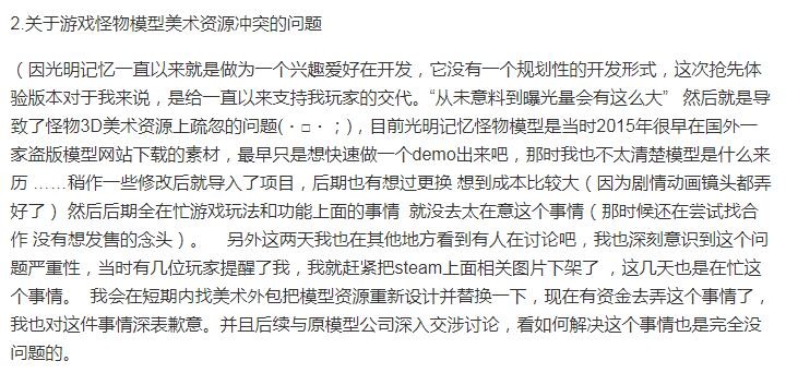 国产FPS游戏《光明记忆》Steam上一经上架就收获了如潮的好评,甚至国外知名主播如Shroud也称赞《光明记忆》“像中国的《毁灭战士》”。甚至被誉为国产游戏之光。 不过也有很多人质疑,仅靠作者“飞燕群岛”一人不可能开发出完成度如此之高的游戏。而最近微博上的争议,让《光明记忆》再次经受考验。 有一位游戏业内模型师(@老鹂)发微博称,《光明记忆》使用的怪物模型素材,源自自己5年前所在的项目《神佑(Bless)》中制作的模型,而飞燕群岛未经许可在游戏中使用了这些模型,但并没有注明模型来源信息,让他十分无奈。 对此,光明记忆的作者@飞燕群岛也在今日发表了微博头条文章做出了回应,声称这是一场误会:
