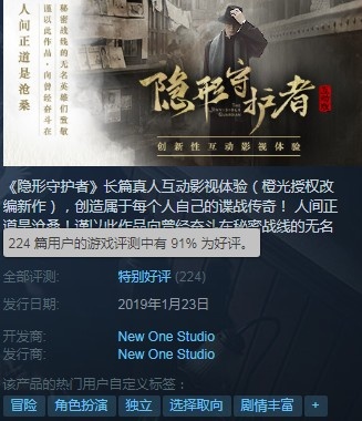 国产互动式电影游戏《隐形守护者》已于昨日在Steam正式解锁,在Steam上收获了91%的好评,玩家纷纷为这款创新式的国产互动式电影游戏推荐加点赞。 虽然说收获了91%的好评,但是这也不意味着这款互动式电影游戏就十分完美了,游戏刚刚上线就出现了网络问题,导致玩家无法加载视频,虽然好评不断但是还是有玩家说这款互动式电影游戏不是他们想象中的视频的形式而是播放PPT,但是大家还是承认了游戏剧情的优秀。 玩家提出的问题官方也在当天收到了反馈,并且将在今日的12:33及时地做出修复,这一点确实值得为制作方点赞。 《隐形守护者》将带你一起回到战火纷飞的动荡年代,成为一名隐形守护者,亲身体验步步为营的谍战人生。你的每一个选择都将影响结局的走向,上百种分支剧情等你解锁!三大完全不同的大结局让你感慨万千! 目前,《隐形守护者》标准版第1-5章Steam售价28元,标准版加第6-10章(终章)捆绑包售价58元,喜欢互动式电影游戏的玩家不要错过! |