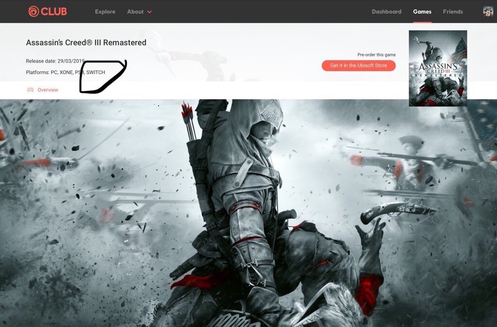游戏开发商育碧近日宣布,原本包含在《刺客信条:奥德赛》季票中的《刺客信条3:重制版》将单独发售,并将在3月登陆PC、PS4和XboxOne,唯独没有任天堂的Switch。然而,Switch玩家并不需要难过,这款游戏似乎仍然还是会登陆任天堂Switch。 《刺客信条3:重制版》将提升材质分辨率,更新图像引擎,增强画质。另外也将改善玩法机制和操作。并且还将整合《刺客信条3:解放》和所有DLC内容。 原本育碧并没有公开Switch平台的《刺客信条3:重制版》,不过当玩家登陆育碧官方网站账号之后,可以看到该游戏明显标记了Switch版。发售日和其它平台相同,都是3月29日。 不知道育碧为什么没有选择和其它平台同时公开Switch版,难道是临时工犯错?或者任天堂为了接下来的直面会蓄力?也许再过几天,我们就能得到准确的答案了。 |