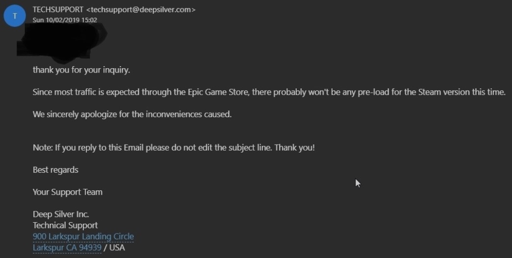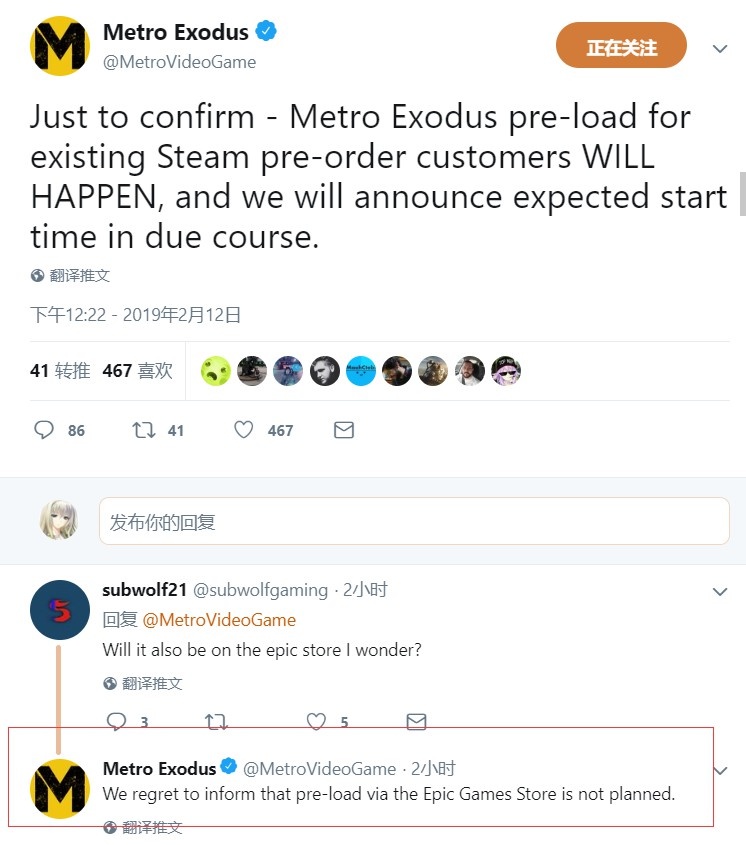 之前Reddit论坛上有网友曝出有关《地铁:逃离》事宜后的官方客服邮件回复,回复中深银似乎不打算给在Steam上预购《地铁:逃离》的玩家提供预载服务。 但是今日《地铁:逃离》官方推特发文,对以上传闻进行了澄清:之前在Steam上预购《地铁:逃离》的玩家将能对游戏进行预载,具体时间将在未来公布。 还有玩家询问了Epic商店情况,《地铁:逃离》官方表示:Epic Game商店无计划开放预载。由此可见,之前Reddit论坛上曝出的客服邮件回复截图可能是假的。 |