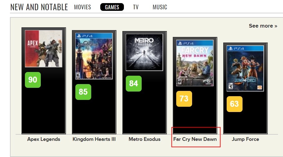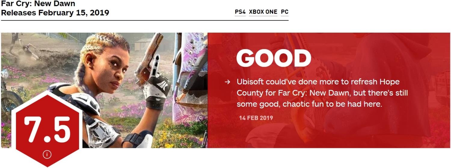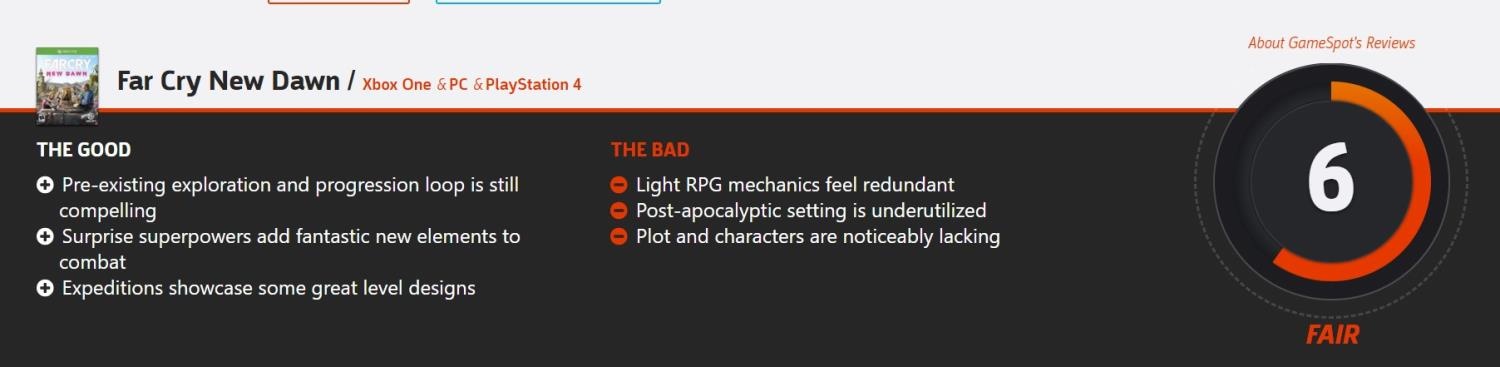 《孤岛惊魂:新曙光》媒体评分解禁,IGN给出7.5分评价,但GameSpot只有6分。本作在Metacritic上目前平均分为73分。 IGN表示,育碧本可以在《孤岛惊魂:新曙光》中做得更多,不过本作仍然有一些值得肯定和好玩的东西。 在《孤岛惊魂:新曙光》中重访《孤岛惊魂5》稍加改动的开放世界,不管是单人还是双人合作,清理哨站,尽可能地产生骚乱,已经证明你可以在这里找到相当多的乐趣。如果没有愚蠢的故事和令人失望的最终Boss,我本来可以忍受的。不过本作的远征是一个令人刺激的新模式,而且故事任务比之前更精彩。 总体来说,《孤岛惊魂:新曙光》是我们等待下一个《孤岛惊魂》大作到来期间一个能令你享受其中的游戏。 2月15日同一天发售的三个大作评分,《地铁:逃离》的评分远远高于《孤岛惊魂:新曙光》和《Jump大乱斗》 GameSpot简评: 优点: 旧的探索和升级机制仍然吸引人 意外的超能力为战斗带来了精彩的新元素 远征展示了一些很优秀的关卡设计 缺点: 轻RPG机制感觉太多余 后启示录设定没有被充分利用 剧情和角色太平庸 评分:6分 育碧在《孤岛惊魂:新曙光》中种下了很多有潜力的种子,但并没有给这么多点子留下呼吸和充分发挥的空间,包括后启示录主题设定,RPG机制,武器,载具,剧情,载具和角色。这趟旅程是一个令人享受的体验,尤其是一旦你获得了超能力,但这大多数是因为继承了《孤岛惊魂5》的战斗和升级模式,产生了足够让你玩下去的动力。对本身来说,《孤岛惊魂:新曙光》是一个美味但又很平庸的衍生作,感觉本可以做得更出色。 其他媒体评分: USgamer – 4/5 Game Informer – 7 Gamespot – 6 We Got This Covered – 3.5/5 Press Start – 9 GamesRadar+ – 4/5 Stevivor – 8 Screen Rant – 3/5 PC Gamer – 70/100 VideoGamer – 8 TrueAchievements – 3.5/5 COGconnected – 77/100 PCGamesN – 7 Hobby Consolas [Spanish] – 80/100 Gameblog [French] – 6 游戏截图: |