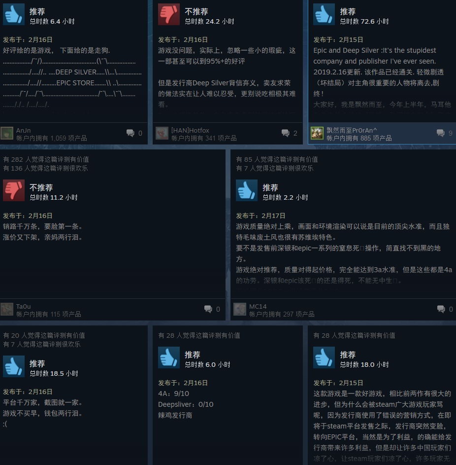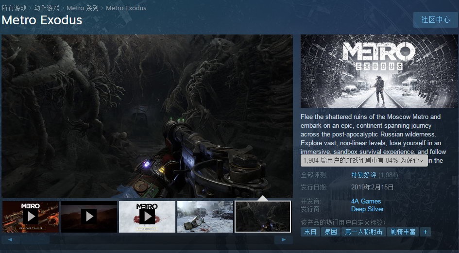 《地铁:逃离》在发售前从Steam下架改为Epic商店独占,这引发了玩家们的不满。《地铁:离去》发售后Steam上评价为“特别好评”,好评率为84%。之前在Steam预购了该作的玩家表示游戏不错,但很鄙视发行商深银和Epic商店。 《地铁:逃离》是由4A Games制作的第一人称射击游戏,灵感取自小说《地铁2033》和《地铁2035》。游戏采用分线性任务系统与沙盒地图以探索刺激的剧情,游历整个春夏秋季,以及核冬季,游戏采用昼夜循环系统以及动态气候系统。 在Steam上有玩家表示《地铁:逃离》质量上乘,画面细节不错,代入感很强,优化也好,各方面都不错。还有玩家表示游戏里的部分人物动作生硬,Bug略多还有卡顿问题,但总体无伤大雅,如果不是发行商这波操作太骚,或许好评率会比现在更高。 |