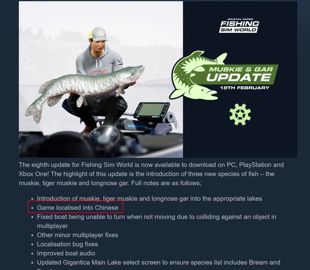 《钓鱼模拟世界》Steam版近日获得了更新,加入了官方中文支持。《钓鱼模拟世界》国区售价70元,最近评测为“特别好评”。 官方表示,“《钓鱼模拟世界》是有史以来最为正宗的钓鱼模拟器,它会引领你享受无与伦比的环世界钓鱼之旅!刺激到肾上腺激素飙升的体验,与大嘴鲈、巨型鲤鱼甚至怪兽级梭鱼酣战一场,享受战胜它们的快感”。