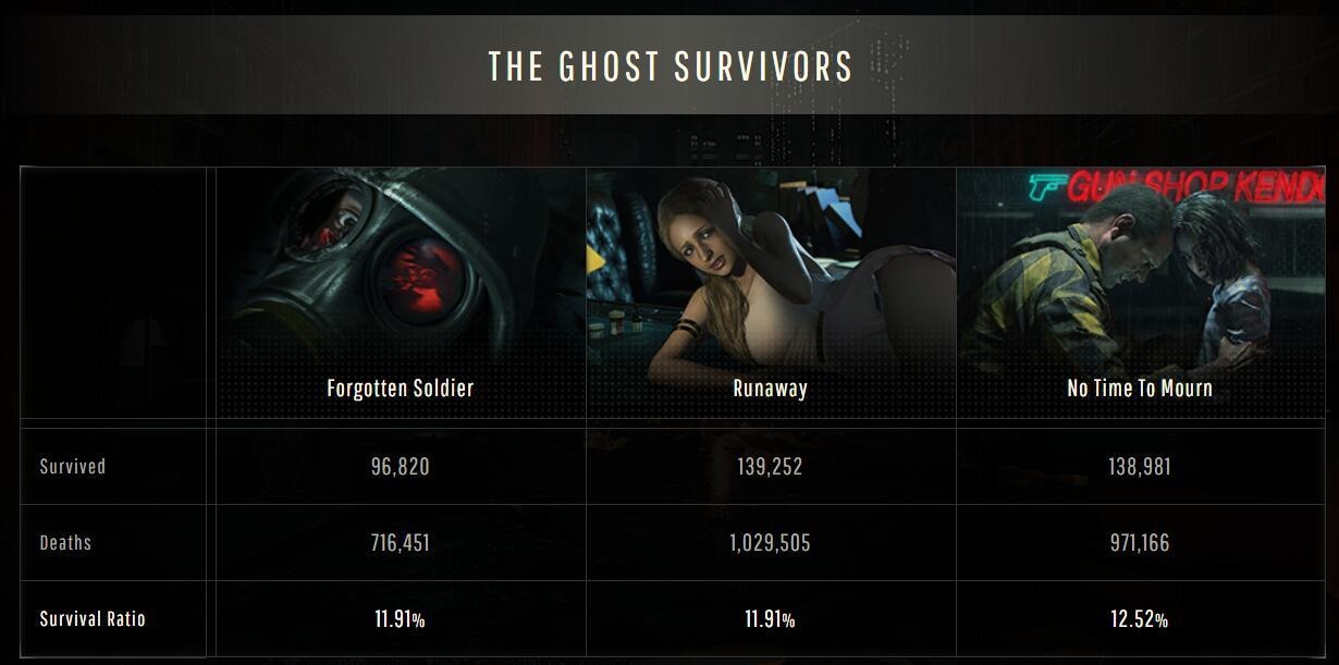 《生化危机2:重制版》推出试玩版时,官方便上线了一个专门统计游戏大数据的residentevil.net网站。随着该作免费新模式“幽灵生还者”上线,网站数据也发生了变化。 “幽灵生还者”模式有三名可选角色:肯多枪店老板、市长女儿和一名伞公司士兵。据统计,玩肯多枪店老板路线的玩家存活率为12.52%,所有尝试中有97万次死亡;市长女儿线路存活率仅为11.91%,100多万次死亡;士兵线路存活率11.91%,72万次死亡。看来这三个模式都非常困难,几乎每玩十次都要死上九次,真的是“九死一生”。 一些之前报道过的数据也有了新变化:全球玩家在《生化危机2:重制版》中投入的总游戏时长已经有将近5624年了;走过的距离叠起来已经快能从地球跑到太阳上了;玩家丢弃最多的物品是小刀,其次是草药;而导致玩家死亡的原因中,“被砸碎”占比9.84%,是最致命的死因。 全球玩家总游玩时长 角色击杀数与死亡数之比 玩家丢弃的物品统计 玩家触发的蟑螂数 《生化危机2:重制版》已登陆PS4、Xbox One和PC平台。 |