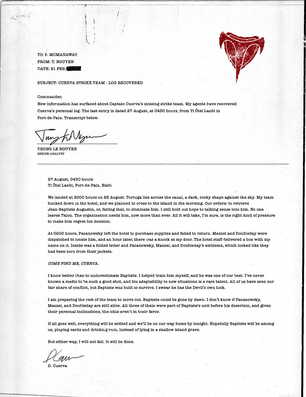今日,暴雪旗下《守望先锋》官方神秘兮兮的更新了一个主题日志以及一个破译代码的小视屏,暗示了第30位英雄即将到来。让我们一起来化身侦探,看看从官方发布中能否获得一些关于新英雄的有效信息。 文件翻译如下: 收件人:F. MCMANAWAY 发件人:T. NGUYEN 日期:____年2月21日 主题:库尔瓦突击小队日志——已寻回 指挥官, 关于库尔瓦队长带领的突击小队失踪一事,我们已经找到了新的情报。我派出的特工已经找到了库尔瓦的个人日志。最后一篇日志更新于8月27日上午4:30,显示位置是海地和平港的兰比酒店。日志文本如下。 高级分析员 TRUNG LE NGUYEN 8月27日,上午4:30 海地,和平港,兰比酒店 我们于8月26日晚8点顺利登陆。龟岛就在海峡对面,在夜幕的映衬下,看上去只是一个黑暗而崎岖的影子。我的小队已经在酒店中驻扎,计划在早上前往该岛。我们的任务是带回让-巴蒂斯特·奥古斯汀,如无法成功,则消灭目标。我仍然希望可以和他讲讲道理。一入黑爪门,终身黑爪人。组织现在比任何时候都更需要他。我相信,给他施加足够的压力,就可以让他后悔自己的决定,乖乖和我们合作。 2点,帕卡诺斯基离开酒店去采购补给,下落不明。我们派出了马泽和道布尔迪去找他的,一个小时后,有人敲响了我的房门。酒店的员工送来了一个盒子,上面写着我的名字。盒子里面是一封折好的信,还有帕卡诺斯基、马基和道布尔迪的标牌,看样子是从他们的衣服上扯下来的。 有种就来找我,库尔瓦。 我很明白,绝对不能低估巴蒂斯特。他是我亲自带出来的兵,是我们中最出色的一员。我从没见过像他一样精通射击的医疗兵,而在适应环境方面他则是罕见的天才。我们每个人都经历过战火洗礼,但巴蒂斯特求生的本领就像是天生的一样。我敢打赌,他的运气一定是受到神鬼的庇护。 我会立刻集结小队剩下的成员,开始行动。如果等到黎明,巴蒂斯特可能会溜走。我不知道帕卡诺斯基、马基和道布尔迪是否还活着。在巴蒂斯特叛逃前,他们三人和他在同一个作战单位里共事过。考虑到他们之前的私人恩怨,三人生还可能性很低。 如果情况顺利,到今天晚上,一切就应该尘埃落定,我们也能回家了。希望到时候巴蒂斯特会跟我们一起,喝着朗姆酒打着牌,而不是孤身躺在孤岛的坟墓里。 不过,无论如何,我都不可能失败。任务必将成功。 D.库尔瓦 从上述文件中我们可以得出的信息有:新英雄名为让-巴蒂斯特·奥古斯汀——典型的法国人;他曾为黑爪一员但是现在叛逃了;精通射击的医疗兵(安娜:没错正是在下);适应环境的天才。 假设官方文件的确指向的是新英雄的话,那么大概率是个法国裔的奶妈,武器为枪械且具备高机动能力。 另外,官方还放出了一段黑客盗取该文件时的操作视频,最后一闪而过黑影的标记,或许这个英雄还会与黑影相关? 关于新英雄的更多信息,还待暴雪《守望先锋》官方在日后娓娓道来。 |