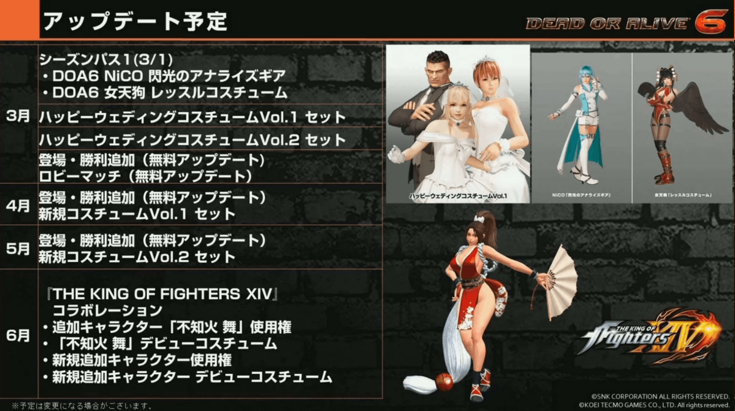 在昨天KOEI TEMCMO的《死或生6》直播活动上,该公司公开了部分全新的游戏内容,对于游戏上市之后的更新计划和安排也给出了时间表。一起来了解一下吧。 首先,《死或生6》中也有其它格斗游戏网络对战所使用的房间对战玩法,玩家可以在网络模式下自建房间,邀请好友或陌生人进入对战。 《死或生6》3月正式上市之后,游戏开发商会在每个月为本作追加新的内容,有些免费,有些收费。比如3月推出女天狗的摔跤手服装、婚礼服装第一集和第二集、免费追加房间对战以及登场和胜利姿势;4月免费追加登场胜利姿势、新服装第一集;5月推出新服装第二集以及免费的登场和胜利姿势;6月会追加来自拳皇的不知火舞及其它新增角色和服装。 《死或生6》确定将于3月1日正式发售,登陆PC、PS4和XboxOne。 |
