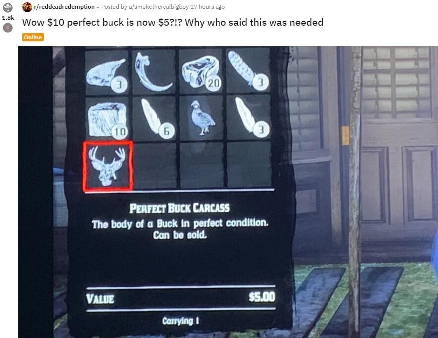 昨日《荒野大镖客OL》大型更新上线,除了加入新武器服装和新玩法之外,还对游戏内容进行了调整。但没想到的是国外论坛Reddit上怨声载道,玩家们彻底怒了。 此次更新之后,有玩家发现打猎获得的动物尸体等物品价值直接砍半,不少猎物的掉落物品数量也有减少的迹象,这增加了游戏中赚钱需要的时间和精力;此外游戏修复了可以前往Guarma岛的BUG,让不少热爱打猎的玩家感到不满。部分玩家还质疑R星开始鼓励玩家互相攻击,比如更新后的每日挑战就包括爆头击杀三名玩家。 当然吐槽最多的还是微交易系统,新更新加入了大量新装备服装,有玩家表示物价太离谱了,帽子居然卖得和武器一样贵。而多种新表情动作价格也非常感人,动辄上百不说,有的甚至需要用金条购买,对此许多玩家表示,R星已经在骗氪的道路上越走越远,他们正在杀死这款游戏。 现在论坛上许多愤怒的玩家表示要放弃《荒野大镖客OL》,继续去体验《荒野大镖客2》故事模式。还有人制作了表情包,以表达自己的愤怒。 |