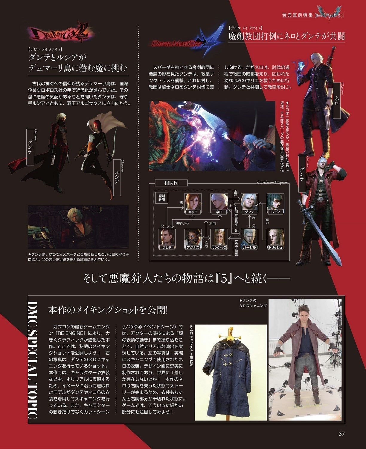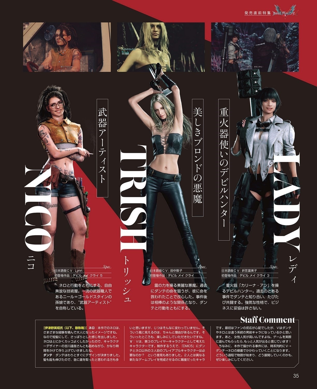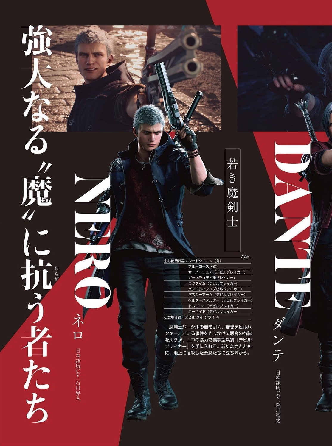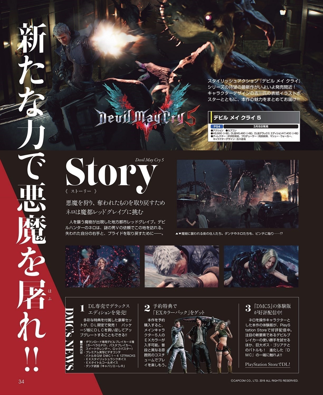 近日,新一期FAMI通杂志带来了《鬼泣5》详细介绍。杂志从游戏剧情、游戏角色、历史背景,系统战斗等方面对《鬼泣5》进行了介绍。 由《鬼泣5》角色设计吉川达哉打造的新概念图也已公开,但丁尼禄还有妮可和V登场,帅气无比。 《鬼泣5》将于3月8日正式发售,登陆PC、PS4和XboxOne平台。 杂志扫图: |
