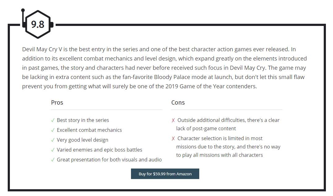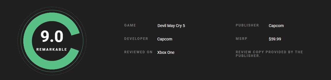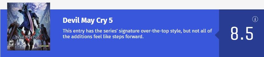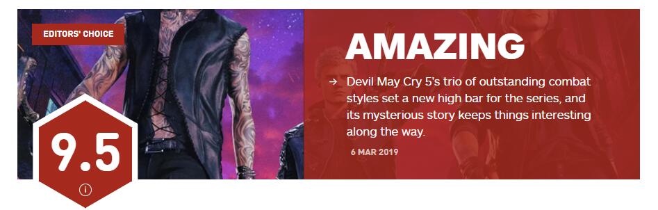 卡普空的知名看门IP之一的鬼泣系列新作《鬼泣5》目前媒体评分已解禁,在这里我们可以看一下这款代表动作游戏新高度的作品表现如何。 首先是大名鼎鼎的IGN,给出了9.5的高分,表示为将鬼泣系列的战斗体验推上了新的高度,剧情方面也相当有趣。 之后是Gamespot,给出了9分,也称赞游戏的战斗系统,V角色以及新机制和剧情。 代表PC平台的PCGamer,给出了90分,表示这是目前PC上最佳的动作游戏之一。 然后是PS4为主的Dualshockers,给出了9.0分,也表示这是该系列的最佳作品之一,编辑也表达了他对该系列的怀念之情,DMC5是该系列的正统延续。 之后是VideoGamer,同样给出了9分,表示战斗体验、整体风格、世界设定都很不错,只是反派和剧情感觉略差。 还有Gameinformer的评分,这里给出了8.5分,盛赞这是该系列图形风格趋向于写实,重复可玩性也不错。 略微综合一些的网站wccftech给出了9.8分,表示战斗机制、关卡设计、图形和音频设计都不错,美中不足的是角色选择相对固定。 |