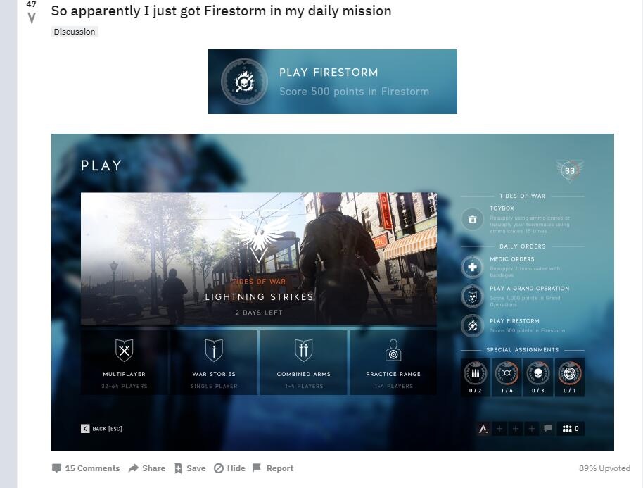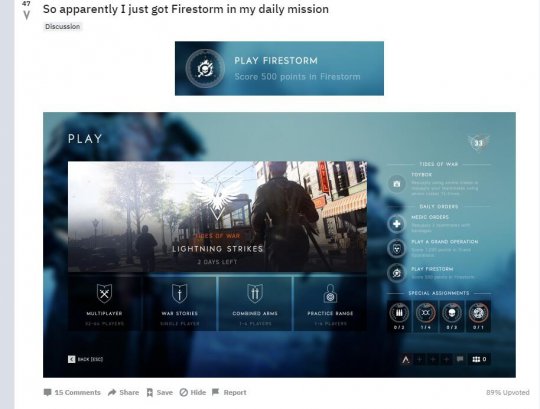 《战地5》的大逃杀模式此前由EA和《Apex英雄》一起公布与众,且预计于今年春正式上线。鉴于现在已经三月,这意味着大逃杀模式“烈焰风暴”随时都可能被添加进游戏中。而Reddit网友firexstudio也证实了这一点。 在他今日po出的游戏截图中显示,他的《战地5》日常任务中赫然出现了:“游玩烈焰风暴模式——在大逃杀中获得500分”。而昨天《战地5》也迎来了一个14G大小的更新补丁,这是不是意味着《战地5》大逃杀已经被加入游戏近在眼前了呢? 在Reddit主楼下的回复中,这也得到了其他玩家的证实,不止一个人的每日挑战中出现了参与大逃杀模式。玩家们纷纷表示对已经在其他游戏玩腻的“大逃杀”压根提不起兴趣,DICE将其加入每日挑战实在是令人烦恼。 |