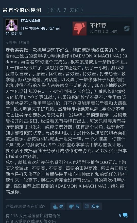 《Left Alive》是一款由SQUARE ENIX开发的动作游戏。游戏在三月六日上线PC/PS4平台,而SE宣传时曾经提出过本作是《前线任务》的精神续作。 这条消息传出之后不少《前线任务》玩家都相当兴奋,摩拳擦掌准备好了钱包,就等着游戏发售准备买买买。 可游戏在三月六日steam商店发售后,立刻就被蜂拥而至的玩家打上了相当多的差评,总体评价也变成了特别差评。 我们steam玩家只玩真实,你给我们玩用心做出来的作品,我们就给你销量给你好评,甚至还自带自来水安利。 可你要是敢仗着大IP就把玩家当成是自动提款机——那对不起,我们就让你知道什么是“人民的眼睛是雪亮的”和“人民斗争的汪洋大海”。那么为什么SE如此重视,甚至挂着《前线任务》精神续作的《Left Alive》会如此干干脆脆地直接扑街了呢? 因为SE这次交出的作品难以让玩家满意。游戏之前在日本地区率先发售时就被玩家们给出了很低的评价。而Steam上的差评原因包括过时的画质、僵硬的动作、糟糕的射击手感和操作手感、游戏性不足,另外优化方面也不太好,不少玩家反映全程PPT,会掉帧,无法流畅运行。 都9102年了,居然还能在SE最新推出的游戏里享受到来自三年前的3A大作流畅度,实在是不容易,甚至可以说是一个奇迹了。 更不要说《Left Alive》已经在日本地区发售了几天,其中PS4版在发售之初除了禁止剧情过场录制外还是允许玩家们上传自己的游戏录像的,而现在PS4已经全面禁止游戏的录像上传功能。结合日本亚马逊已经将本作的售价下调了44%,从8964日元(约合人民币536元)下降至5050日元(约合人民币302元)的行为,我们不难得出一个显而易见的结论——SE这是嫌自己口碑不够差所以故意作死么? 但这样的游戏,这样的厂商,又会让玩家们怎么想呢?评论区静候大家的看法。 |