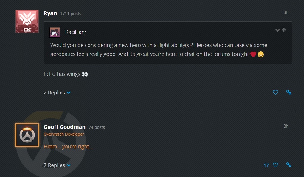 去年暴雪嘉年华上,《守望先锋》发布的动画短片《重逢》中出现了一个女性智械Echo,这是未来可能会出现的英雄,近日首席设计师Geoff Goodman在官方论坛与玩家互动时,暗示Echo有飞行能力。 “你们会考虑出一个具有飞行能力的新英雄吗?” “Echo就有翅膀。” “Hmm...你说的没错。” 不过有网友注意到Geoff没有指定这句话是回复给哪一条贴文的,因此这可能只是一个烟雾弹。 |