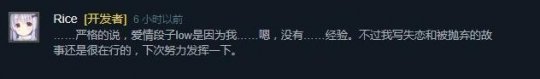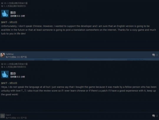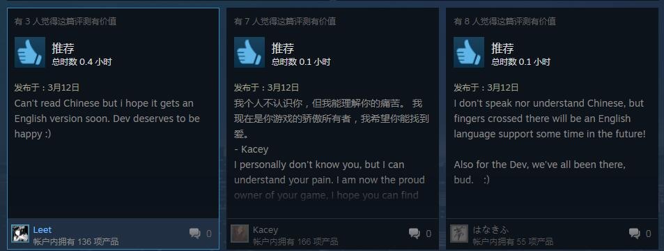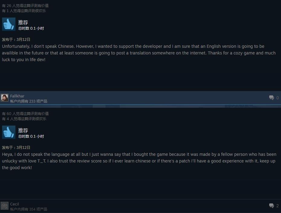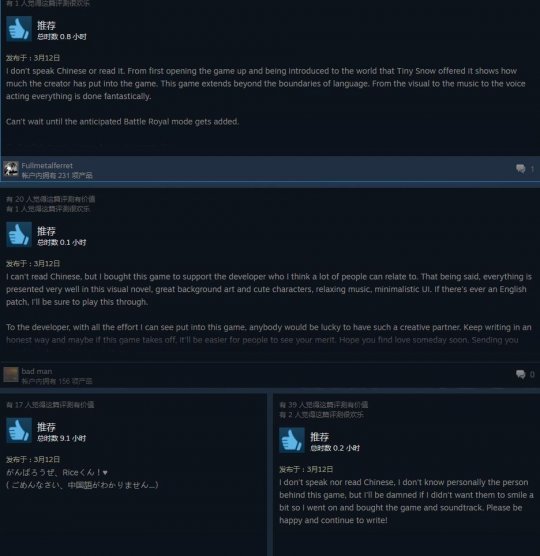 上周我们曾报道过,国产Galgame《茸雪》的开发者在回应一位玩家对于“爱情段子有点Low”的疑惑时凄惨自曝:爱情段子low是因为自己没有经验,但是对失恋和被抛弃还是很在行。此番朴实却又令人悲痛的话语一度成为话题,也变相助推了一波游戏的曝光率。→点我跳转前情提要 万万没想到的是,今日这段回复被外媒译制传到了国外,在推特上瞬间收割了成吨人的同情和心碎,触景伤情的老外们纷纷站出来要力挺这位坚持自我充满勇气(不幸方面)的开发者老哥,于是就有了如下的最新评论区奇景: 开头一句“I don’t speak chinese(我不会中文)”,好评全靠爱!慕名而来的老外们纷纷带着0.1小时的游玩时间来给作者鼓劲了!他们基本上都是这么说的:“虽然我不会中文,看不懂游戏,但是我希望开发者也能够感受到人世间的爱(拥抱),希望他能继续创作下去,经历过痛苦的人应该得到支持。哦顺带一提游戏的画面和音乐也很不错。” 国产游戏,而且还是小众的Galgame,受到老外的好评轰炸可能还是头一遭,不知道开发者知道自己的游戏因为自己“真实的不幸”而走出国门火了一通会是什么想法。 大部分老外:我不会中文但假如我不去支持一下这个作者我要这4美元有何用! 目前推特上转载外媒翻译的推文还在持续传播,在这两天可能还会有老外持续的涌入,也不经让人好奇作者是否会对此作出回复呢?不管过程如何,走出国门的国产Game,还是值得高兴的。 |