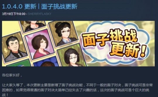 今天,《中国式家长》制作组为游戏更新了全新的“面子挑战”功能,不同于之前的面子对决,玩家们在“面子挑战”中将面对7位更加厉害的“狠角色”家长,是时候让孩子们出来一较高下了! 《中国式家长》的制作组,今天在Steam商店页面发布了公告说:“各位家长好,让大家久等了,本次更新主要是新增了面子挑战功能,不同于一般的面子对决,面子挑战可是非常困难的,如果觉得普通的面子对决太简单已经失去了兴趣的话,这次的面子挑战可是个巨大的挑战!”《中国式家长》的这次更新,在游戏的“事务”界面中增加了“挑战”选项,玩家将会在7个家长中随机遇到5位,如果玩家挑战成功,孩子将获得特殊的特长奖励,所以各位“虎妈狼爸”们赶快来培养一个战无不胜的孩子吧。 详细更新内容: 面子挑战 1.“事务”中新增了“挑战”,到达一定年纪后可进行面子挑战,获得奖励 2.共有7个对手,每个世代会随机到其中的5个 3.每个对手都是狠角色,非常难挑战并且对于部分类别的特长免疫 4.打倒对手后,会得到属性以及特殊特长奖励 5.面子挑战胜利的结果会在族谱中体现 6.特长图鉴中新增了特长筛选功能 7.日程安排时,可根据是否已经解锁特长图鉴进行筛选 其他更新和优化 1.调整了安排界面中对于已经解锁了特长图鉴的提示 2.修复了积极的压力/满意度事件也触发消极音效的问题 3.修复了【化妆助理】和【音乐助教】职业提示显示位置的错误 4.修正了部分男女通用特长的名称 5.修正了部分错别字 6.优化了体育线同学苏豪的立绘 各位玩家小时候有经常被父母们和其他的同龄人比较的经历吗,没准在大家玩过这个新功能后,会对“家长们的面子”有一个新的理解吧。 |