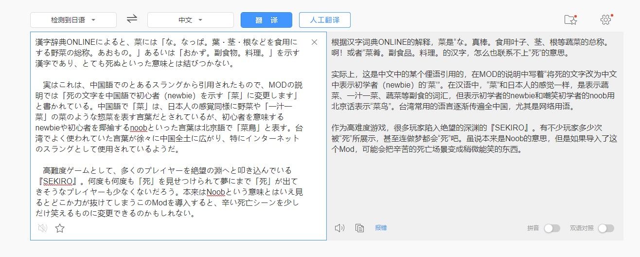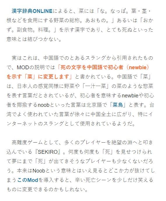 昨晚我们报道了《只狼》“菜”字MOD,作者将玩家死后出现的“死”替换成了“菜”,引起了国内网友的热烈讨论。有玩家甚至建议将“菜”换成“弟弟”,也有玩家表示,“正楷的菜字太不给力,换成草字狂书更嘲讽~”。看来,网友们比MOD作者更“丧心病狂”。。。 有趣的是,这个MOD也引起了日本游戏媒体DenFamiNicoGamer的关注。日媒甚至特意向日本玩家解释了“菜”“菜鸟”等字在中国的另外一种含义。 日媒解释说,根据汉字词典,“菜”的愿意是“食用叶子,茎,根等蔬菜的总称”,或者是“菜肴”的意思,和游戏中的“死”字怎么也扯不上关系。但实际上,这是网络用语,“菜”代表着你是菜鸟,代表你是新手或是嘲笑新手。 不过日媒的解释有些地方也不太对。日媒解释说,“有不少玩家多少次被【死】字所展示,甚至连做梦都会【死】吧。虽说本来是菜鸟的意思,但是如果导入了这个Mod,可能会把辛苦的死亡场景变成稍微能笑的东西”。真要换成这个MOD,玩家都要气炸了吧,还会笑出来? |