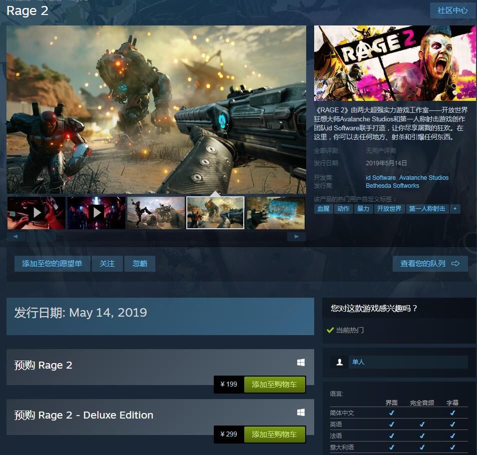 就在今天Bethesda与Epic独占的潮流背道而驰,站出来力挺Steam,宣布即将发售的多款游戏除了在自家的Bethesda.net平台发售之外还会在Steam上推出,并且根本没有提及Epic平台。而与此同时预定5月14日发售的末世题材《狂怒2》的Steam商店界面也已经公开,想要在Steam预购游戏的小伙伴们可以下手了。 可以得知Steam端《狂怒2》定价标准版为199RMB,豪华版为299RMB。而在Steam预约《狂怒2》会获得独家的“死神邪教”支线任务。豪华版中包含的额外内容有拓展任务、特殊武器以及加快游戏进度的“作弊工具”等。 游戏介绍: 《狂怒2》由两大超强实力游戏工作室——开放世界狂想大师雪崩工作室和第一人称射击游戏创作团队id Software联手打造,让你尽享屠戮的狂欢。在这里,你可以去任何地方、射杀和引爆任何东西。游戏旨在提供最为硬核的动作体验、无需读取时间的开放世界环境以及载具战斗、可升级武器,新作与前作一样采用第一人称视角。玩家将扮演一名Walker,这是废土上的最后“游骑兵”,这些游骑兵可以使用各式强力武器和独特的纳米科技能力来穿越地形、打击各种势力、对抗各种变异人和“当局”的规则。 游戏截图: 《狂怒2》将于5月14日发售,登陆PC、PS4和Xbox One平台。 |
