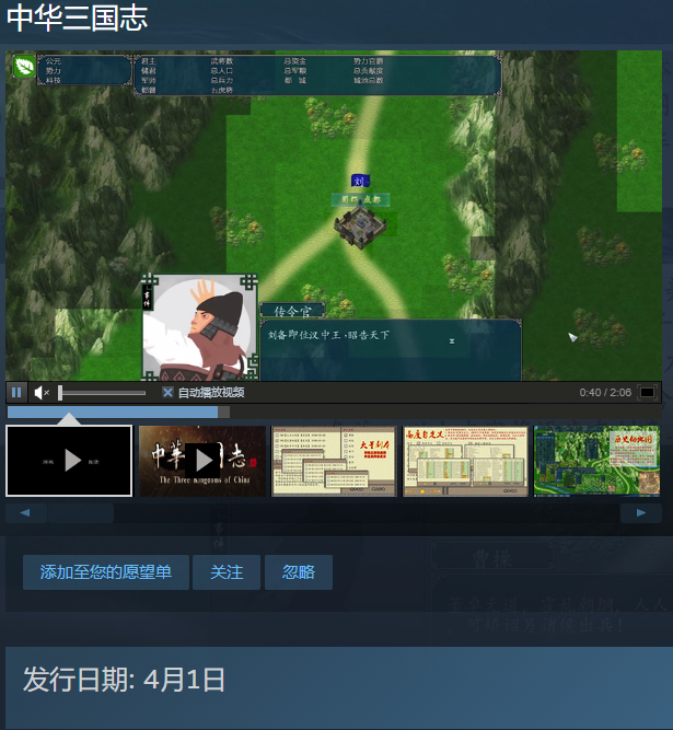 《中华三国志》是由国内民间团队开发研制的一款免费开源的单机策略三国游戏,可以在手机、平板、电脑等进行游戏。如今,历时一年准备,开发团队终于做好了上架Steam的准备。 这款策略游戏至今已经有十年的历史了,据称没有开发商,没有资金,只有一个梦想,现如今的游戏画面看上去确实还不尽如人意,不过游戏内容还算可以,有兴趣的玩家可以稍加关注一下,Steam上架时间是4月1日。 放上几张官方游戏截图: