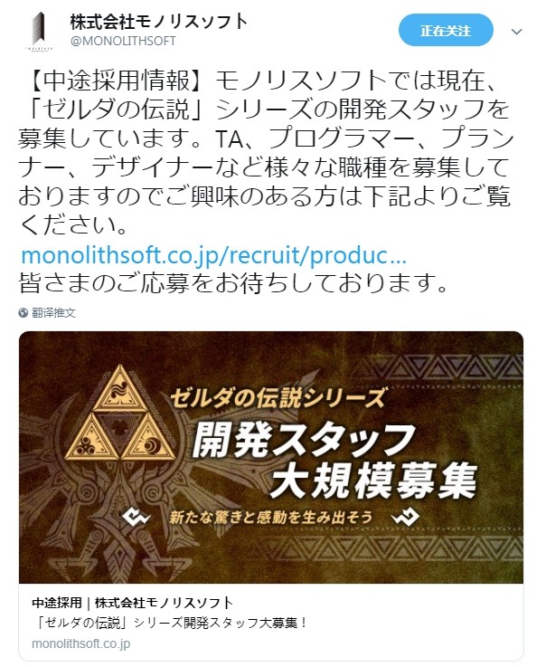 任天堂旗下工作室Monolith Soft今日发布公告宣布,他们正在为《塞尔达传说》系列游戏新作大规模招聘,并表示要“创造新的惊喜与感动”。 本次官方放出的招聘页面当中,出现了美工、程序员、策划、设计师和项目经理等职位需求。Monolith Soft曾是《塞尔达传说:荒野之息》的开发商之一,为游戏的成功立下了汗马功劳。 虽然不知道这款《塞尔达传说》新作开发进度如何,但离它面世可能还很早,不过我们倒是有希望在今年的游戏展活动上见到老任公布这款游戏。 作为参考,《塞尔达传说:荒野之息》开发历时4年,有超过300位开发人员参与项目。 |