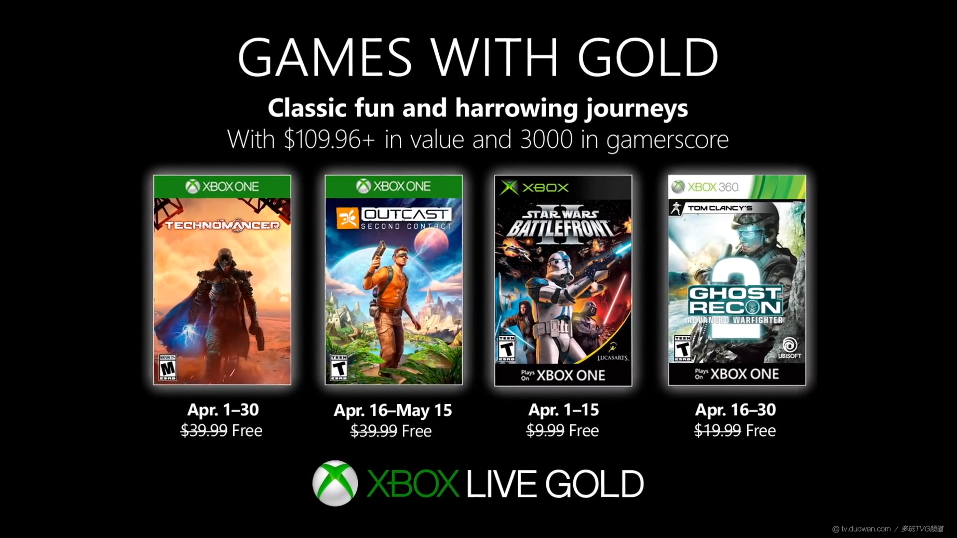 (多玩网3月27日上午消息)微软今日公布了Xbox金会员2019年4月的会免游戏,Xbox One和Xbox 360各两款,其中Xbox 360的两款已加入向下兼容,本次会免的时间从2019年4月1日~2019年5月15日不等。 具体会免名单如下: Xbox One:《机械巫师》(2019年4月1日至2019年4月30日) Xbox One:《时空英豪:二度接触》(2019年4月16日至2019年5月15日) Xbox 360:《星球大战:前线2》(2019年4月1日至2019年4月15日) Xbox 360:《幽灵行动:尖峰战士2》(2019年4月16日至2019年4月30日) |