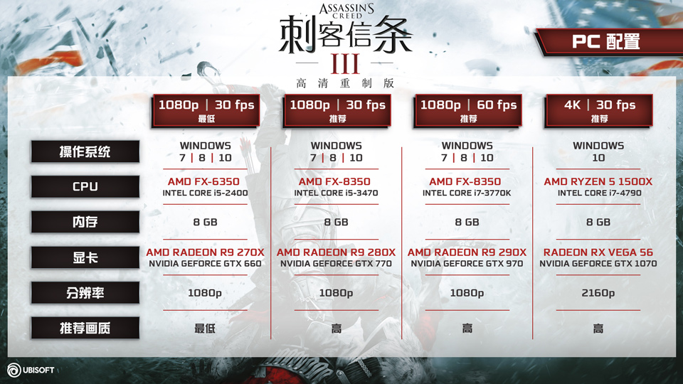 今天,育碧公布了《刺客信条3》高清重制版在PC平台的最低配置以及推荐配置。 《刺客信条3》高清重制版将在PC平台上支持4K及HDR功能,同时包含更高分辨率的贴图效果,全新的图像引擎以及其他一些图像增强功能。 《刺客信条3》高清重制版将于3月29日登陆PC平台。其内容将包含完整版游戏,单人任务“本尼迪克特?阿诺德”、“隐藏机密”、DLC《暴君华盛顿》以及《刺客信条3:解放》高清重制版 《刺客信条3》高清重制版PC配置要求如下: 最低配置(30帧) 操作系统:Windows 7 SP1、Windows 8.1、Windows 10 (仅64位) 处理器:Intel Core i5 2400 @ 3.1 GHz、AMD FX 6350 @ 3.9 GHz 内存:8GB 显卡:Nvidia GeForce GTX 660、AMD Radeon R9 270X (2GB显存且支持Shader Model 5.0) 分辨率:1080p 显示预设:最低 推荐配置1080p(30帧) 操作系统:Windows 7 SP1、Windows 8.1、Windows 10 (仅64位) 处理器:Intel Core i5 3470 @ 3.2 GHz、AMD FX 8350 @ 4.0 GHz 内存:8GB 显卡:Nvidia GeForce GTX 770 (4GB) 或AMD Radeon R9 280X (3GB)或更高 分辨率:1080p 显示预设:高 推荐配置1080p(60帧) 操作系统:Windows 7 SP1、Windows 8.1、Windows 10 (仅64位) 处理器:Intel Core i7 3770K @ 3.5 GHz、AMD FX 8350 @ 4.0 GHz 内存:8GB 显卡:Nvidia GeForce GTX 970、AMD Radeon R9 290X 分辨率:1080p 显示预设:高 推荐配置4K(30帧) 操作系统:Windows 10 (仅64位) 处理器:Intel Core i7 4790 @ 3.6 GHz, AMD Ryzen 5 1500X @ 3.5 GHz 内存:8GB 显卡:Nvidia GeForce GTX 1070 或Radeon RX Vega56或更高 分辨率:2160p 显示预设:高 想了解更多《刺客信条3》高清重制版的相关信息,请关注育碧官网和育碧中国官方微博。 |