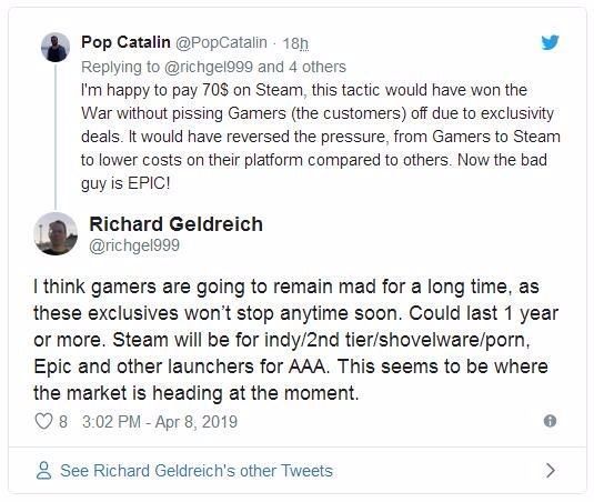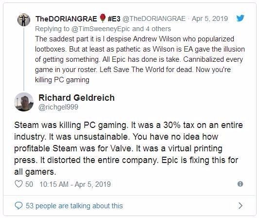 现如今EPIC和steam的斗争已经进入了白热化。在这场PC游戏平台之间的战争中,国内的玩家群体舆论当然是一边倒的支持G胖哥哥和steam,但国外不少玩家却持不同的态度。 近日有前Valve的员工在推特上抨击Steam,他表示Steam在抹杀PC游戏,而Epic正在收拾Steam的烂摊子,拯救游戏市场。 这位前Valve员工似乎了解什么V社的黑幕,发布的言论中也包含着对Steam很多负面的看法。他表示:“Steam对游戏厂商的抽成达到了30%。这是不可持续的。你根本不知道steam对于Valve来说有多么赚钱,它简直就是一台虚拟的印钞机。它也扭曲了Valve这个公司。而Epic正在为所有玩家补救这个错误。” 此外他还推断未来几年内EPIC依然会和一些游戏厂商签订独占协议,玩家们依然还是要抓狂一段时间,因为独占协议不会那么快就结束,但是一旦这样的情况成为了现实,那么Steam平台就会变成比如一些杂牌游戏以及小黄油之类的聚集地,大部分的3A大作都投奔到EPIC那去了。 不过确实,如果按照他所描述的趋势,PC游戏业确实有相当大的可能会向这个方向发展。但在最近几个月内Epic Games商店已经够饱受争议了。其对游戏的独占策略以及锁区成了玩家谈论的焦点。 EPIC对于PC游戏的竞争手段十分简单粗暴,就是将游戏统统放到自家商城独占。对于如此极端的做法相当多玩家都表示难以接受——PC游戏又不是主机平台,搞什么平台独占有什么意思?本就以自由开放为特征的PC游戏非要整封建复辟? 更何况对于国内玩家来说EPIC本身的锁区行径就已经足以成为它被口诛笔伐的万恶之源了。限时独占加锁区,彻底堵死国内玩家玩游戏的路,罪无可恕。国外玩家以及前Valve员工的言论,不过是站着说话不腰疼而已。而作为国内玩家“被锁区”的诸位又有什么看法呢? |
