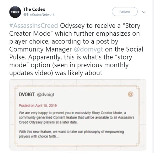 育碧的社区经理Dominik Voigt不久前发布了一则帖子,上面写道:“我们很高兴为您介绍独家的故事创作模式,这项由玩家社区驱动的特质将在晚些时候向所有《刺客信条:奥德赛》玩家开放。” 这篇帖子在发布不久之后就遭到了删除,但有外媒分析表示此模式的内容有可能会被加入剧情中,并进一步强化玩家的选择。 |