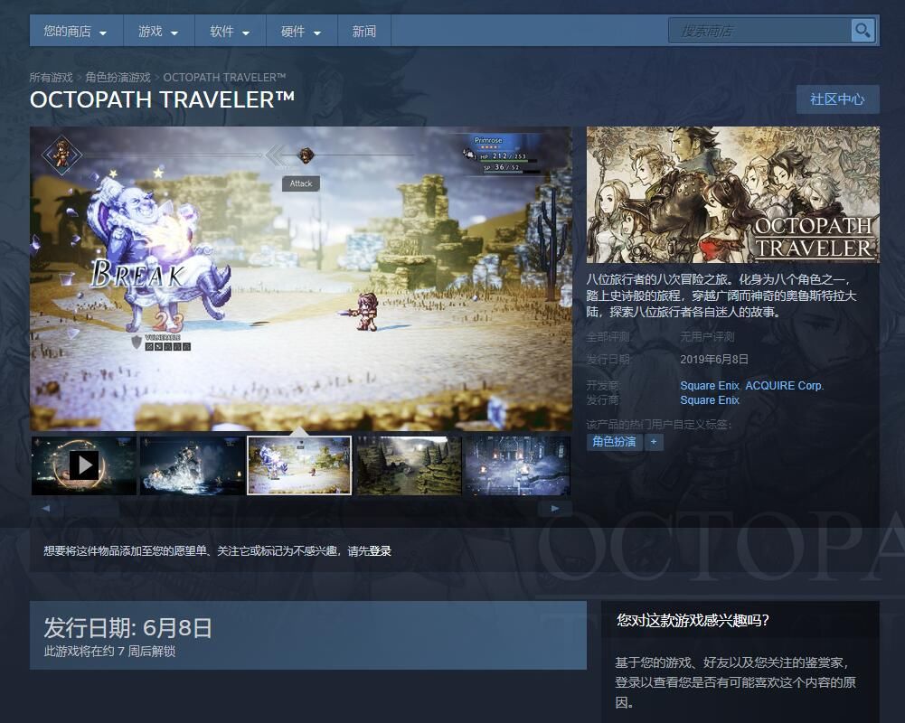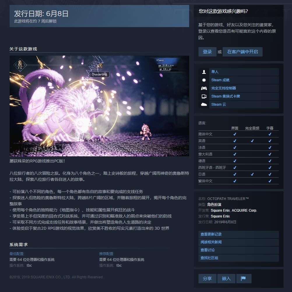 由史克威尔打造的、之前登陆任天堂Switch的知名复古JRPG游戏《歧路旅人》(原译八方旅人OCTOPATH TRAVELER)现在将会通过Steam登陆PC平台,目前这款游戏的Steam产品页面已经创建。玩家可以浏览一下获得相关信息。 从支持语言这里我们可以看到,游戏官方支持简体中文,游戏具有英语和日语两种配音。游戏的配置信息还没有公布,虽然看似这是一款复古像素画风的游戏,但实际上是采用虚幻4引擎开发,提供了看似复古实则极具纵深感和动态感的画面,所以应该对硬件配置还是有一定要求的。 |