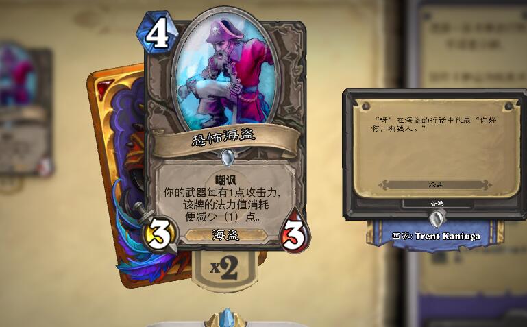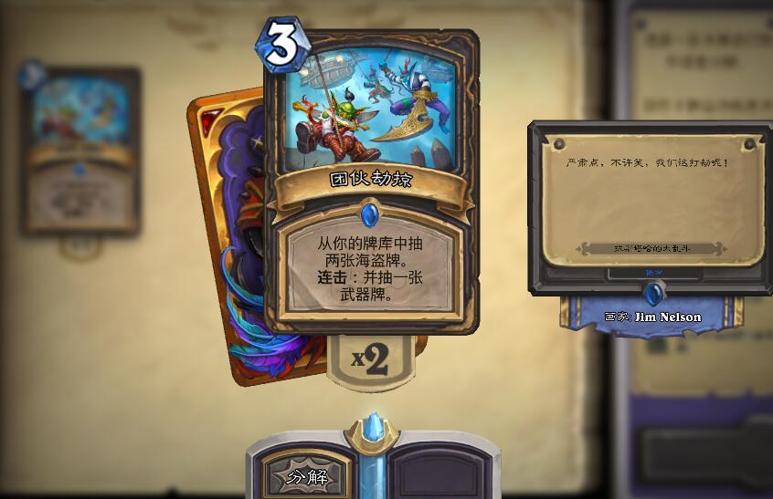 脸黑摸不到武器和海盗怎么办?这时候你可能就需要这张团伙劫掠了。只要摸到一张恐怖海盗,就是血赚。在起手的时候尽量找1费的南海船工和团伙劫掠,这样会提高中期combo发动的成功率。