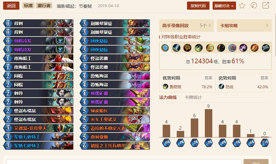 #图片来源于炉石传说盒子 卡组代码 AAECAaIHBrICyAOvBOf6AqCAA5KXAwy0Ac0D1AXuBogH3QiGCabvAtWMA7SRA4+XA4mbAwA= 这是目前胜率最高的一套节奏贼卡组,可以看到想要组建这样的一套卡组,花费也是相当高的,总共需要六张橙卡和四张紫卡。但是就目前的环境来看,这样的花费绝对是物超所值。作为一套主打中前期的卡组,节奏贼在前期最为关键的combo,就是摇摆矿锄+两张恐怖海盗了。 #图片来源于百度搜索 目前天梯中大多数的职业在前期都缺乏有效的解场手段,牧师的群体狂乱倒是可以解场,然而牧师已经被其他职业打得抬不起头,因此大家丝毫不用担心牧师的存在。两个恐怖海盗的防御性,相对来说要强于它们的进攻性。不论是大范还是荆棘帮暴徒,在海盗们的保护下几乎都可以打出不错的输出。