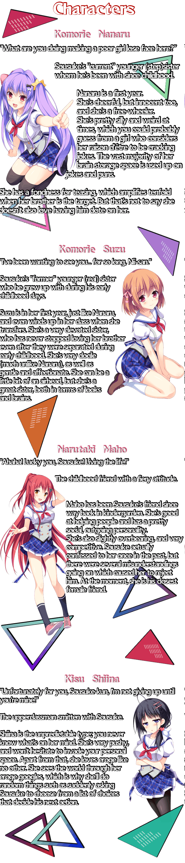 NekoNyan日前公布消息,ASa Project开发的喜剧恋爱视觉小说《喜欢与喜欢的三角恋》将于5月31日推出Steam版本。 故事简介:小森江宗介是御宅族社的成员,并且每天跟妹妹小森江七瑠及青梅竹马鸣泷真帆过着愉快的学校生活。某一天,宗介被对他一见钟情的学姐木须志衣菜告白,而小时候就跟宗介分开的亲妹妹小森江铃也回到了家里。这两件事情让宗介的日常生活有了重大变化。 小森江七瑠(小森江 七瑠(こもりえ ななる),聲:五十鈴みゆう/清水愛) 宗介没有血缘关系的妹妹,阳和学园一年级生,御宅族社成员。个性天真活泼,喜欢有趣的事物。 小森江鈴(小森江 すず(こもりえ すず),聲:鹿野まなか/熊乃可菜) 宗介的亲妹妹,年幼时跟着宗介的生母一起搬到别的地方,后来被接回小森江家居住,并转入阳和学园一年级。性格溫厚。 鳴瀧真帆(鳴滝 真帆(なるたき まほ),聲:卯衣/大橋步夕) 阳和学园二年级生,御宅族社成员。从幼儿园便和宗介一起玩耍的青梅竹马,以前曾拒绝过宗介的告白。喜歡格鬥電玩。 木須志衣菜(木須 志衣菜(きす しいな),聲:北見六花/小野涼子) 阳和学园三年级生,宗介的学姐。对宗介一见钟情并不断对他展开攻势,后来更主动加入御宅族社。喜欢玩成人游戏。 |