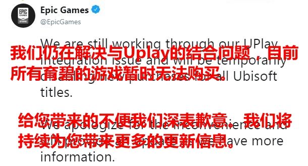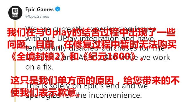 今日,Epic商场刚刚解锁国区,并且可以使用支付宝/微信付款,而且还是低价区,这让许多游戏粉丝们乐开了花。但是粉丝们会发现,为什么在Epic开放国区之后却找不到育碧的游戏,对此Epic在官方推特上给出了解释。 近日,Epic在官方推特中说:“我们在与Uplay的结合过程中出现了一些问题。目前,在修复过程中暂时无法购买《全境封锁2》和《纪元1800》。这只是我们单方面的原因,给您带来的不便我们表示歉意。”一开始还只是针对《全境封锁2》和《纪元1800》这两款游戏,但是Epic又接着发了一条,如下: 新回复中,Epic说:“我们仍在解决与Uplay的结合问题,目前所有育碧的游戏暂时无法购买。给您带来的不便我们深表歉意。我们将持续为您带来更多的更新信息。” 目前,Epic并没有给出育碧游戏重新上架的时间,但是这一下架事件并不是针对国区开放,目前Epic商城已经全面下架育碧游戏,预计在与Uplay结合的问题解决后会重新上架。 |