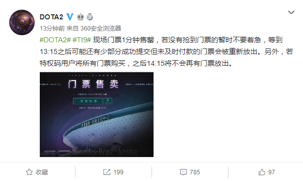 今天(5月24日),按照DOTA2官方之前的公告,中午12点将会在大麦网优先对拥有“勇士令状”或“DOTA PLUS”特权码的玩家开启门票购买活动。但因V社官方原因,原定于12点的门票售卖时间被延迟至13点进行。 玩家们即使怨声载道,身体还是很诚实的准时守候在购票页面。即使这次优先购买需要玩家拥有DOTA2游戏内增值服务“勇士令状”或“DOTA PLUS”以取得特权码,根据DOTA2官微消息,三种套票,共计9268+9268+8268=26804套门票仍然在1分钟之内售罄,可见广大中国Dotaer的热情。 根据DOTA2官方消息,可能会有少部分的门票会在13时15分之后会被重新放出,14时15分之后将不会有门票再放出。 当然,能买到门票的幸运儿毕竟是少数,而长时间困扰大家的“黄牛”问题以及购票时间的突然延迟也令许多玩家心生不满。 此外,在某宝上已经有黄牛开始兜售此次TI9的门票,值得一提的是这些“黄牛票”甚至还能挑选座位。 此次TI9,中国战队已经确定有PSG.LGD、VG、KG三支战队受到直接邀请,根据V社的规则,赛季积分前十二的队伍可直接参赛,现在积分前十二的队伍中EHOME尚未能确定是否有直邀资格,祝他们在之后的MINOR赛事中取得好成绩,争取直邀。也希望各位抢到票的朋友能在现场充分享受这次DOTA2最高级别的赛事,没抢到票的朋友可以选择在DOTA2客户端或各大直播平台一起为中国战队加油。 |