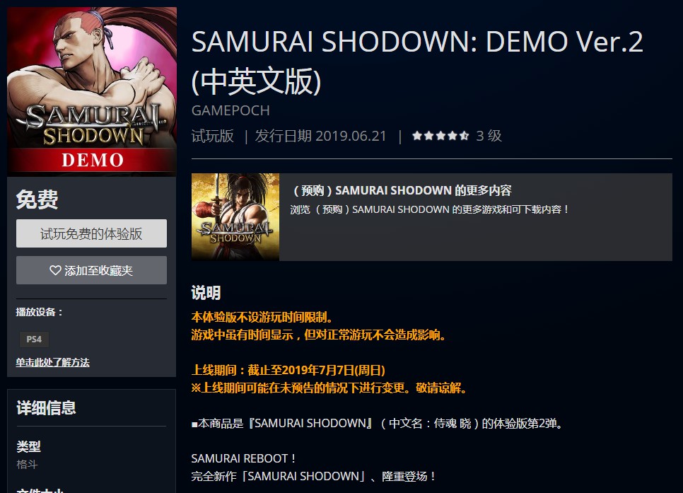 《侍魂:晓》试玩版第二弹目前已经上架PS港服商店,截止2019年7月7日之前都可以免费进行下载游玩,体验版中将不会设置游玩时间限制,虽然会有时间显示,但不会造成影响。 体验版内容包括: ·可玩角色 1、牙神幻十郎 2、橘右京 3、夏洛特 ·可玩游戏模式 练习模式/ 对抗模式/指南模式 ·可玩时间 无限制 |