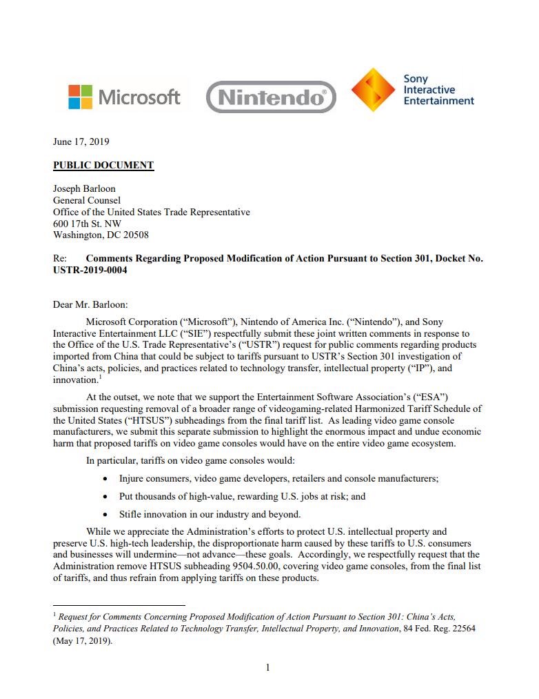 索尼、微软、任天堂日前向美国贸易代表办公室提交联合声明,反对美国在中美贸易战中对在中国地区生产的主机产品征收25%的高额关税。 文件指出,在2018年,96%进口美国的游戏主机是在中国制造的。针对游戏主机的关税将伤害消费者、视频游戏开发商、零售商和主机制造商;将成千上万高价值、高回报的美国工作岗位置于危险之中,也将扼杀行业内外的创新。 美国在今年5月开始调整关税政策,受此影响的包括游戏主机、手柄,以及街机游戏机。任天堂因此不得不将Switch生产线从中国迁移到东南亚地区。 文章也指出,我们赞赏政府加强中国知识产权的保护,但视频游戏机并不是本次调查知识产权的重点,中国开发和品牌化的游戏主机几乎不存在。我们商业模式的利润率较低,因此其窃取知识产权生产假冒游戏机的动机异常薄弱。游戏主机也是一种相对复杂的设备,因此,生产侵权或非法产品所需要的工作量和成本将不能以潜在的回报为依据。 |