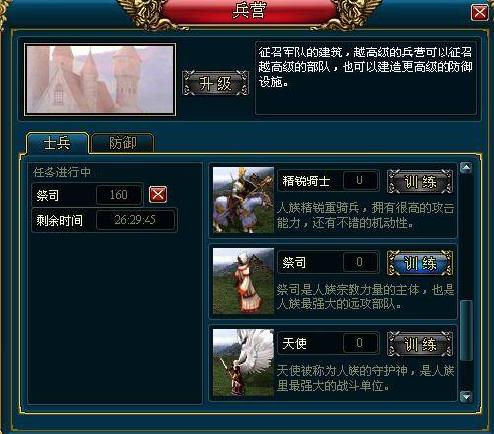 天使(需要建筑:兵营9级、马厩7级、铁匠铺8级;需要技能:制造技术8级) 生命:400 攻击:128 防御:114 速度:8.88 负重:90 攻击模式:近战 比较鸡肋的一个近战部队,由于下一级就是终极近战部队大天使,而在各性能都比不上大天使的天使却也需要大量的资源和时间,要说最大的优点就是,需要研究和升级的建筑与科技比较少,但大家还是宁愿把时间和资源花在训练更高级的近战部队上。 大天使(需要建筑:兵营10级、马厩9级、铁匠铺10级;需要技能:制造技术9级、练兵技术9级) 生命:600 攻击:174 防御:138 速度:9.89 负重:100 攻击模式:近战 传说中的神为守护人类而派来的使者,拥有强大的攻击力,而且速度也很快,在前排的话能够一回合达到对方的前沿阵地,所以大天使是很好的肉盾+攻击部队,但是其缺点就是造价昂贵,训练时间过久,不适合大批量训练。 看完了人类的兵种的介绍,你是不是已经被这些神奇的生物所吸引,想赶快进入《英雄之城》的奇幻世界中去呢?对于新手玩家来说,人类是个不错的选择,前、中、后期都拥有自己的特色。 |